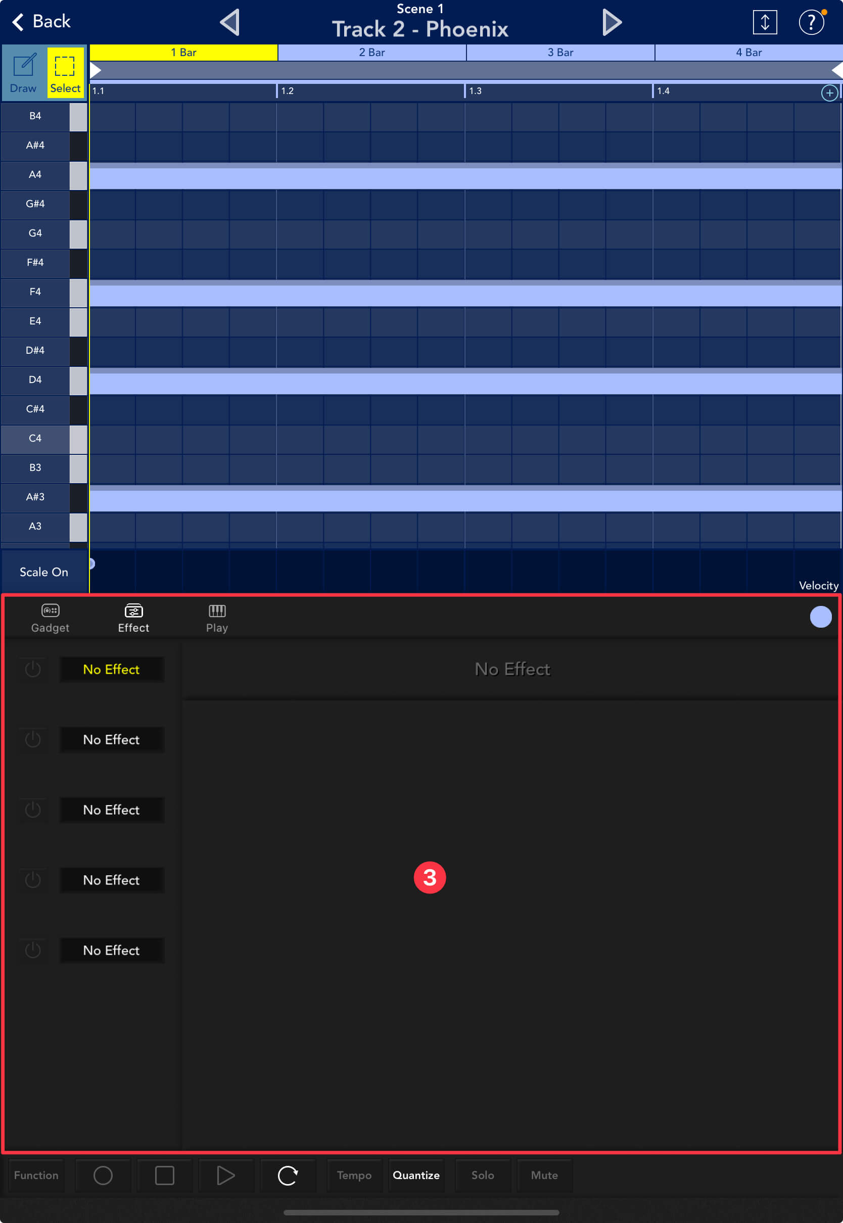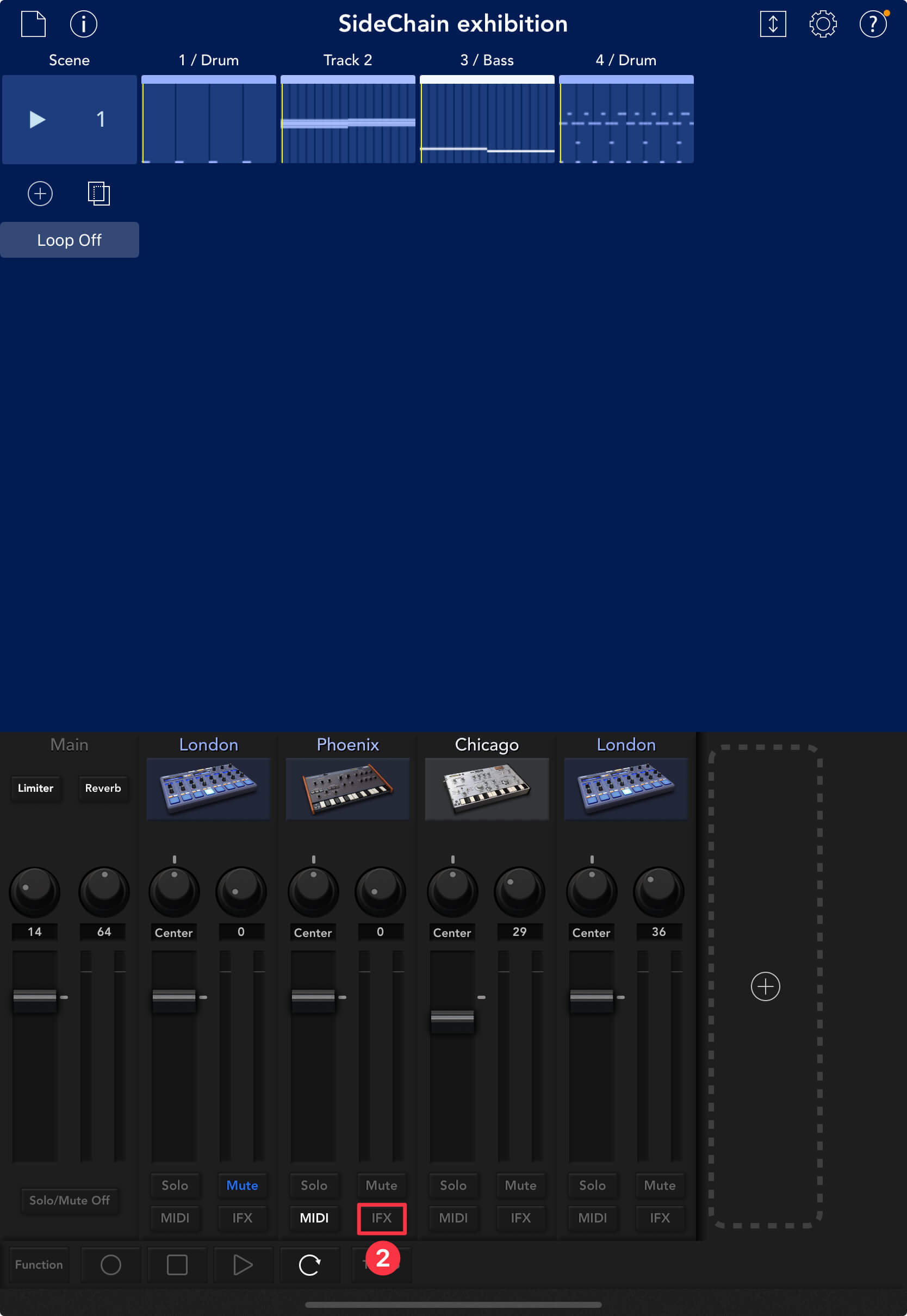 メイン画面に戻り、これからサイドチェインをかけるトラックのIFXボタンをタップ②。Effectパネルに移動します③。