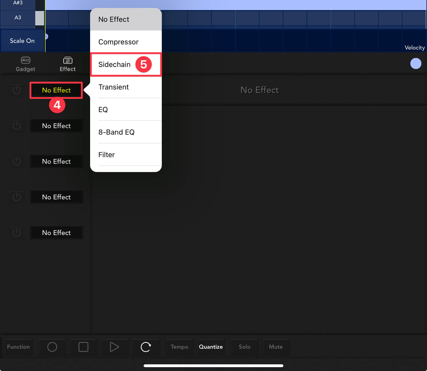 一番上にあるスロットをタップ④し、Sidechainをタップ⑤。