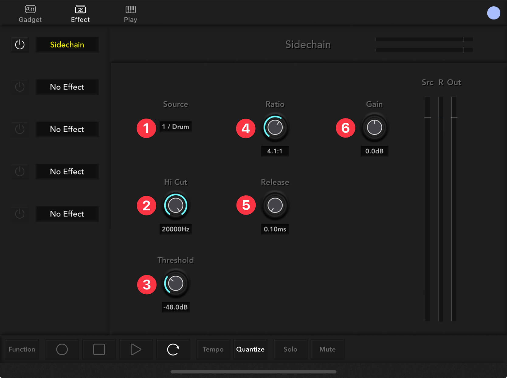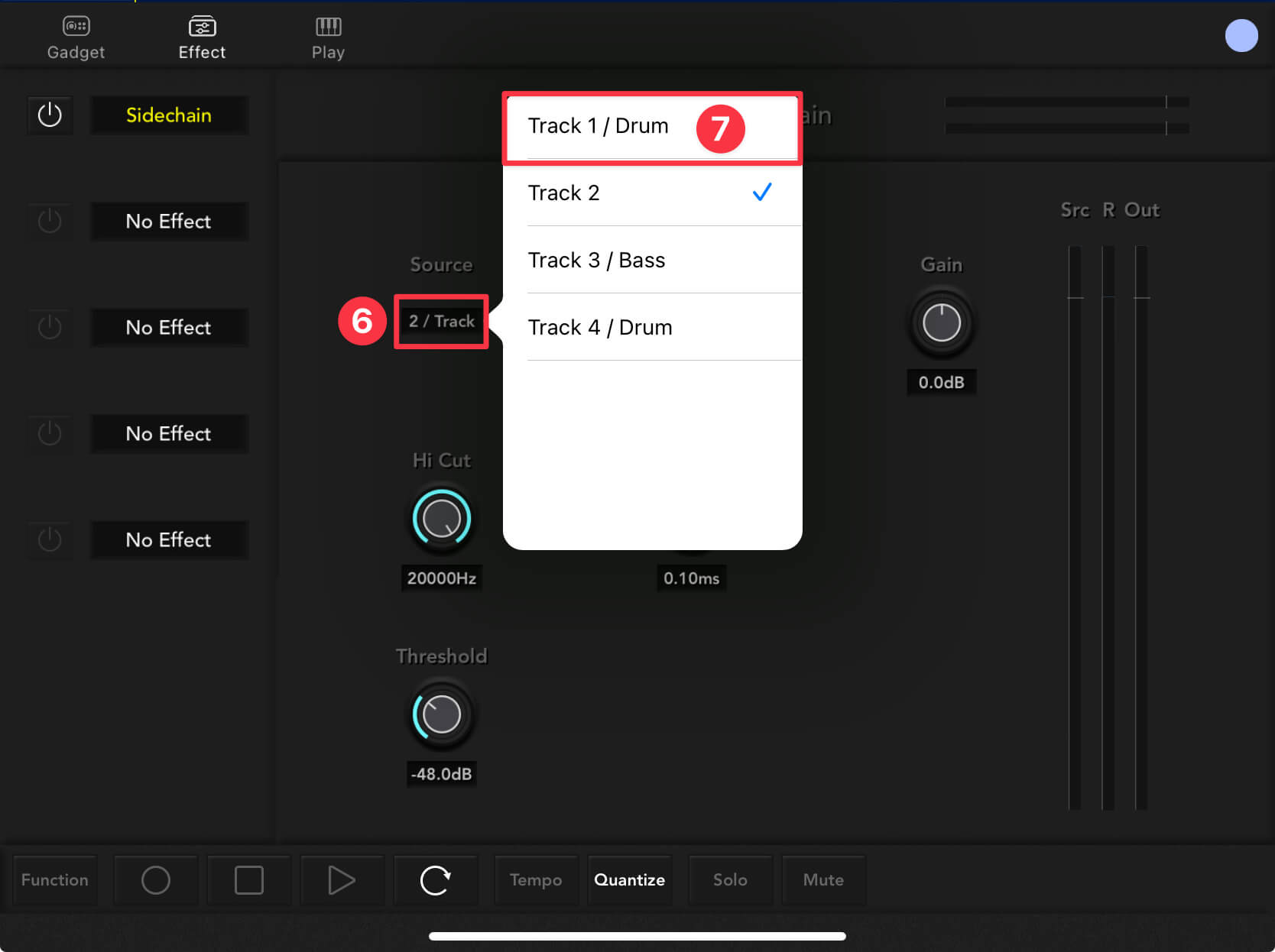 トラックにSidechainがインサートされます。Sourceをタップし⑥、先ほどサイドチェインのトリガーとして4つ打ちキックで作ったTrack 1 / Drumをタップ⑦。これでサイドチェインがセットされました。