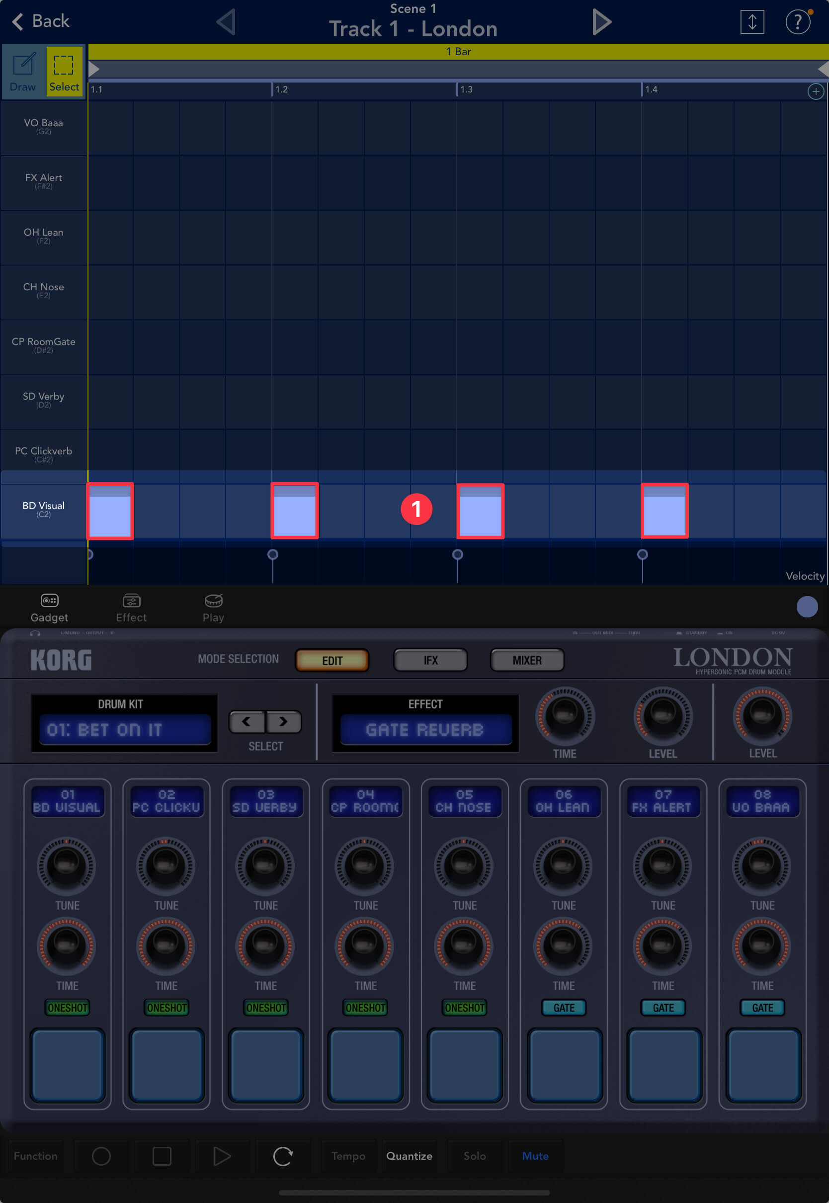 まずはLondonなどのドラムガジェットを立ち上げて、キック用のTrack 1を作り、4つ打ちキックだけを打ち込みます①。