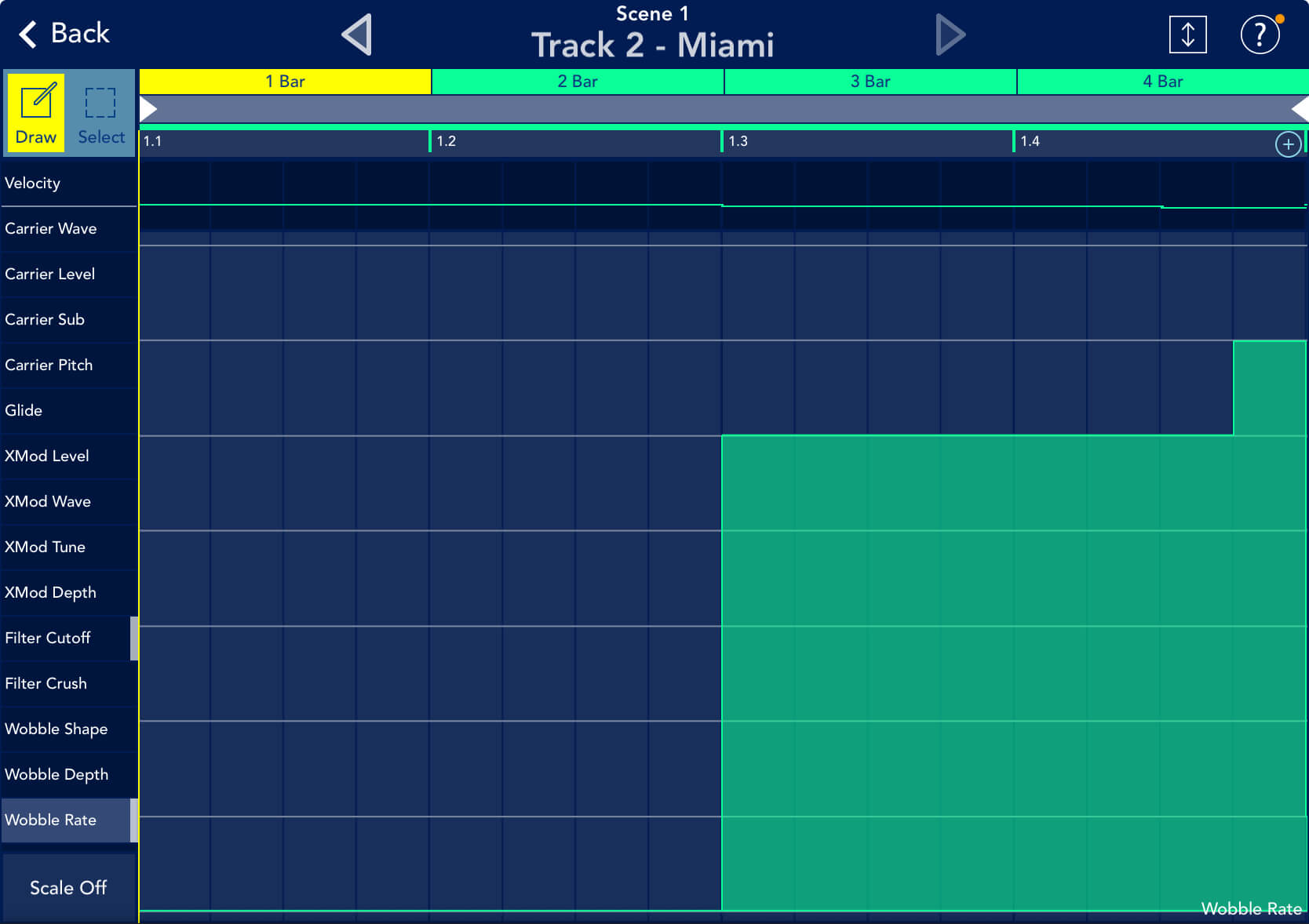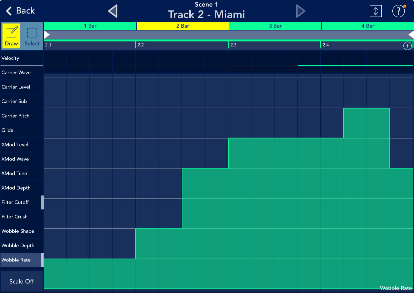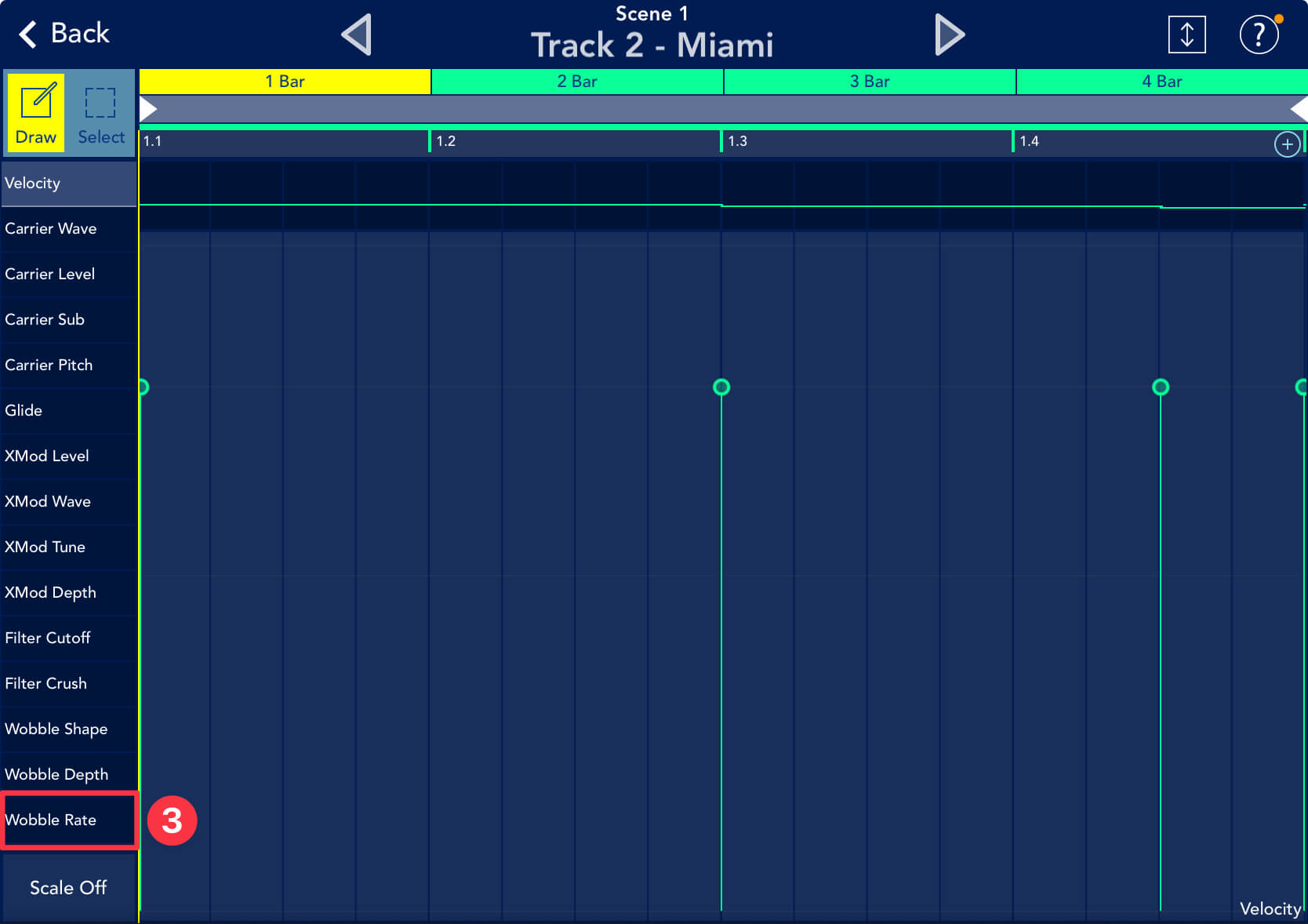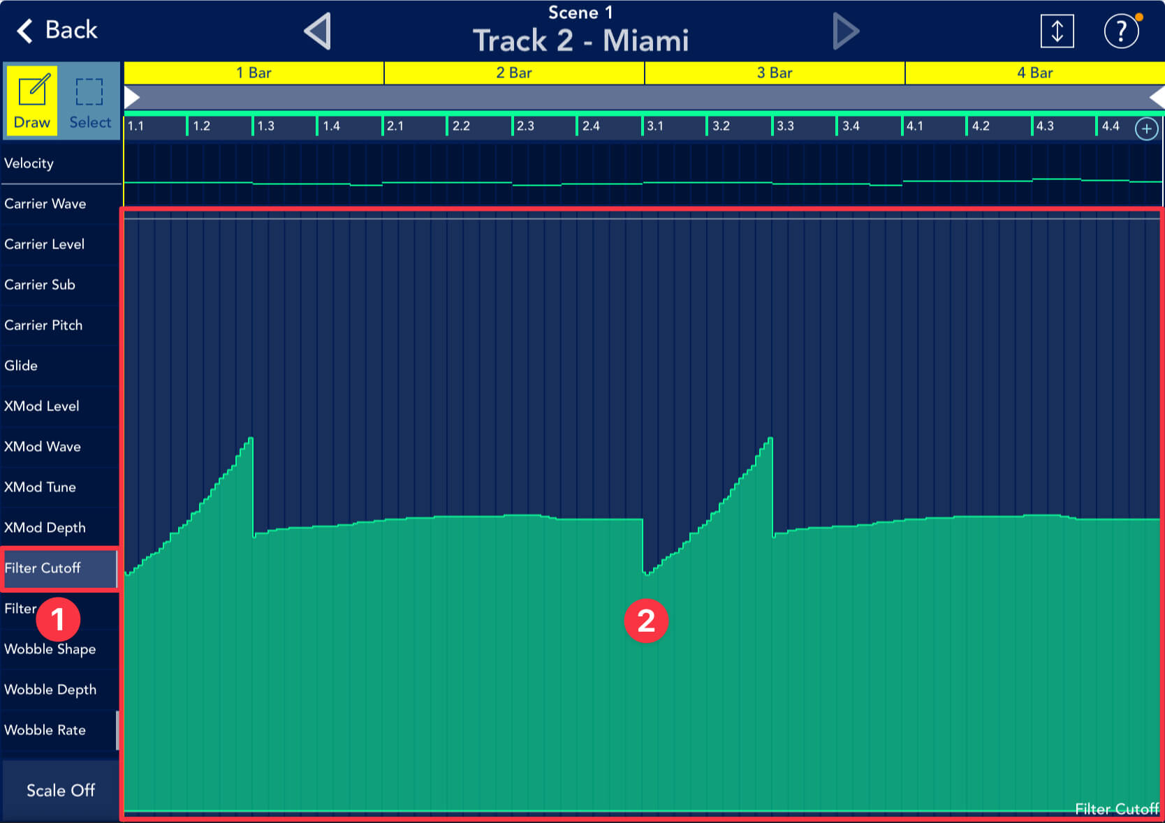 フィルター(Filter Cutoff①)をタップしてオートメーションを書く②と、変化に富んだワブルサウンドが得られます。以下の画面は4 Bar分を同時に表示させています。