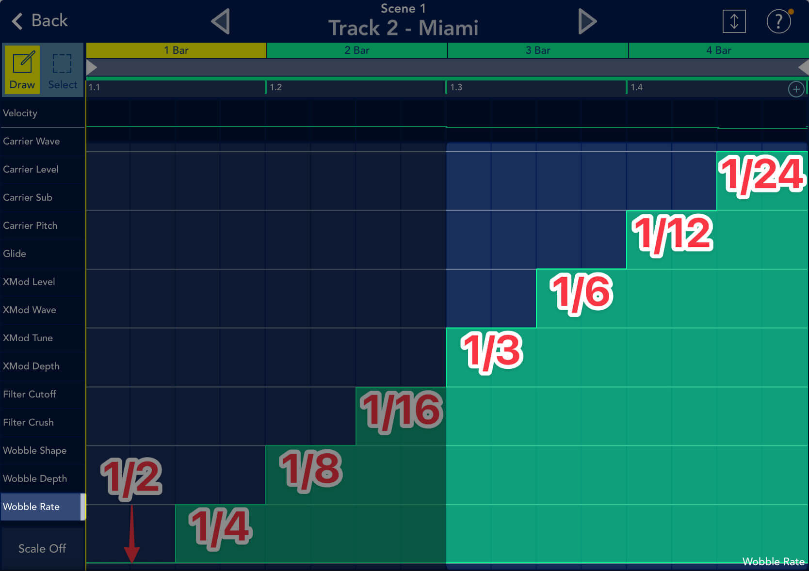 それは、ワブルベースのパートに「3連フレーズ」のニュアンスを取り入れること。つまりWobble Rateの、1/3、1/6、1/12、1/24を、効果的に用いるのです。