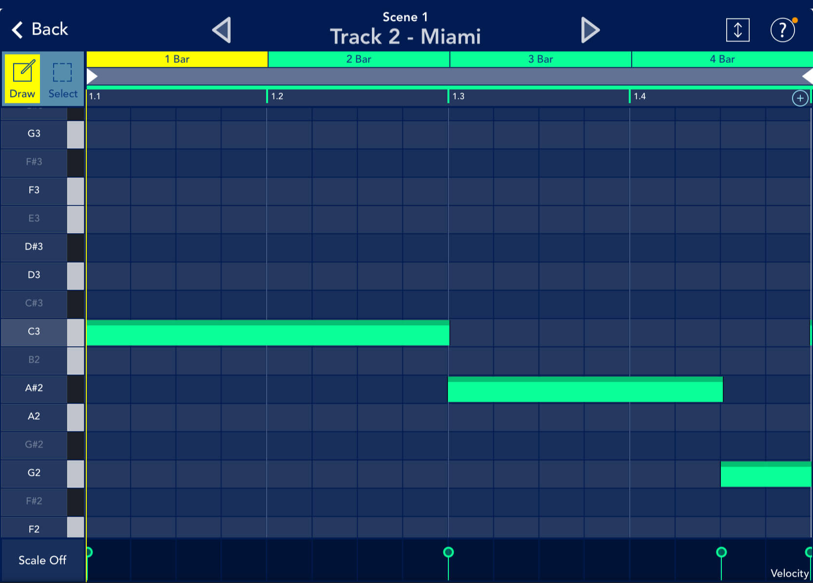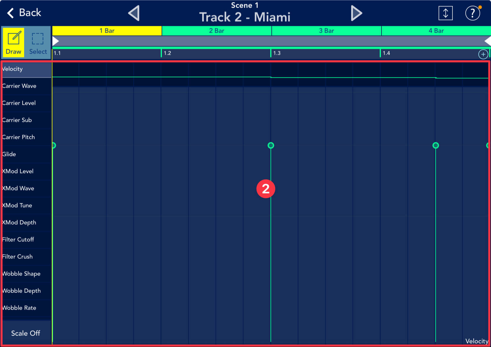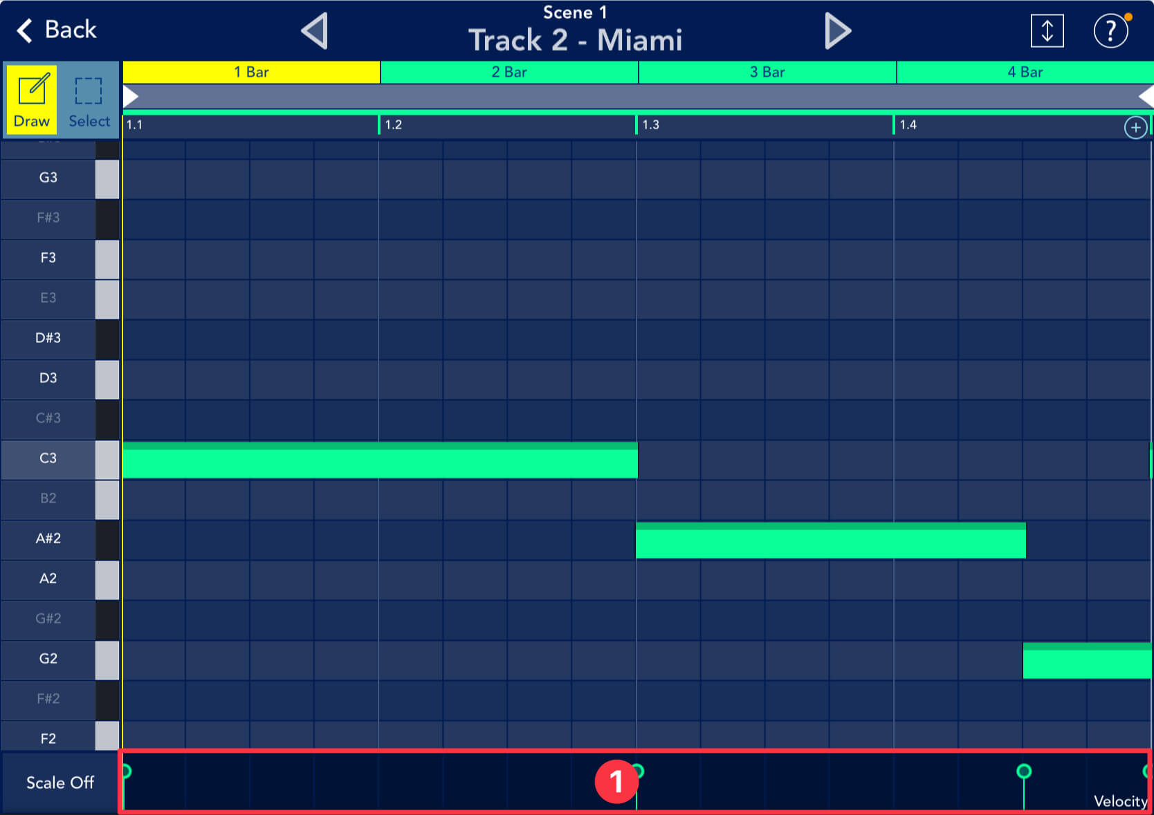 実際にやってみましょう。ピアノロールのパラメータープレビュー①をタップしてください。パラメーターが拡大表示されます②。