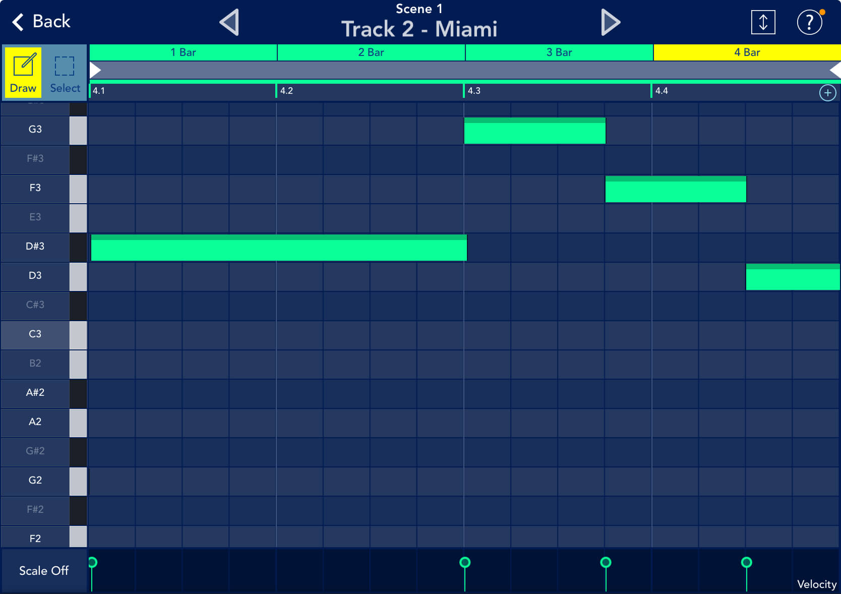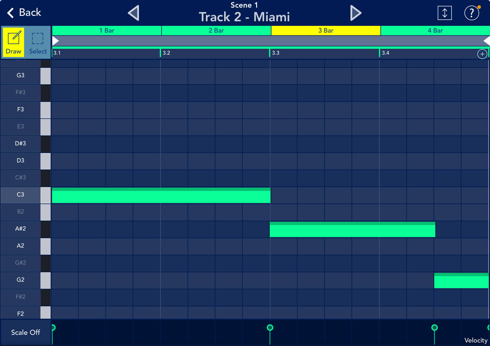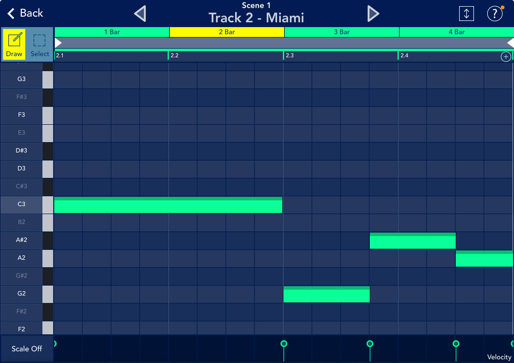 実際にやってみましょう。ピアノロールのパラメータープレビュー①をタップしてください。パラメーターが拡大表示されます②。
