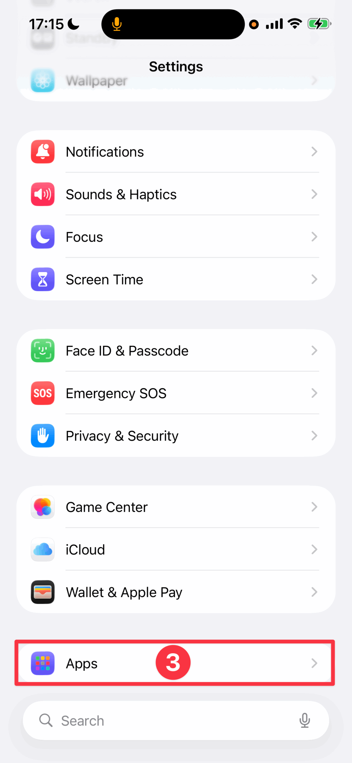 On the Settings screen, scroll down ② and tap Apps ③ at the bottom.
