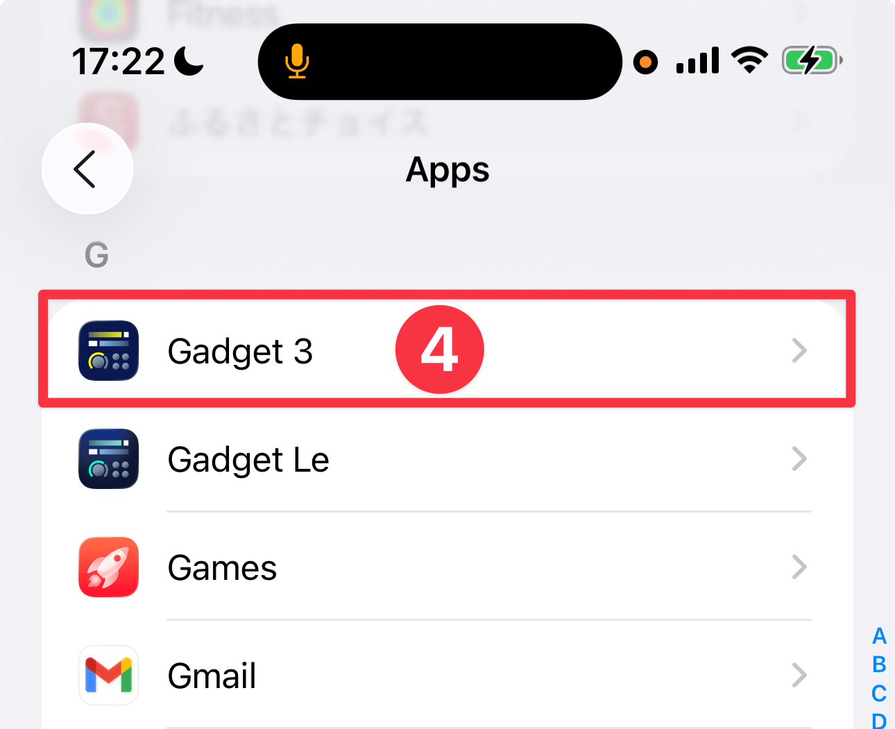 Find and tap Gadget 3 (④) to switch to the KORG Gadget settings screen (⑤).