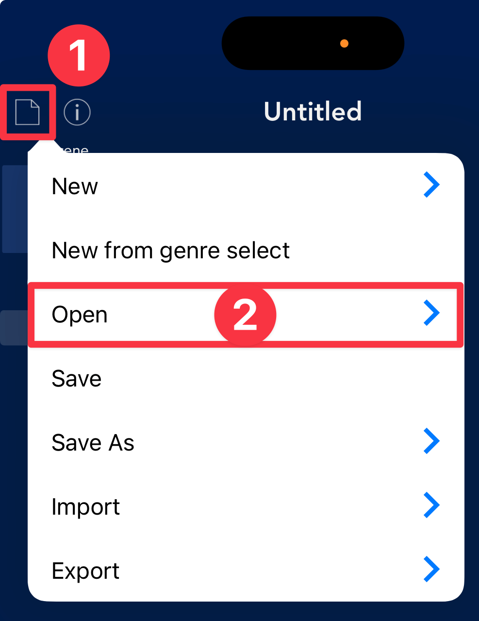 First, tap the file button ① at the top left of the screen. A speech bubble-like menu will appear, so tap Open ②.