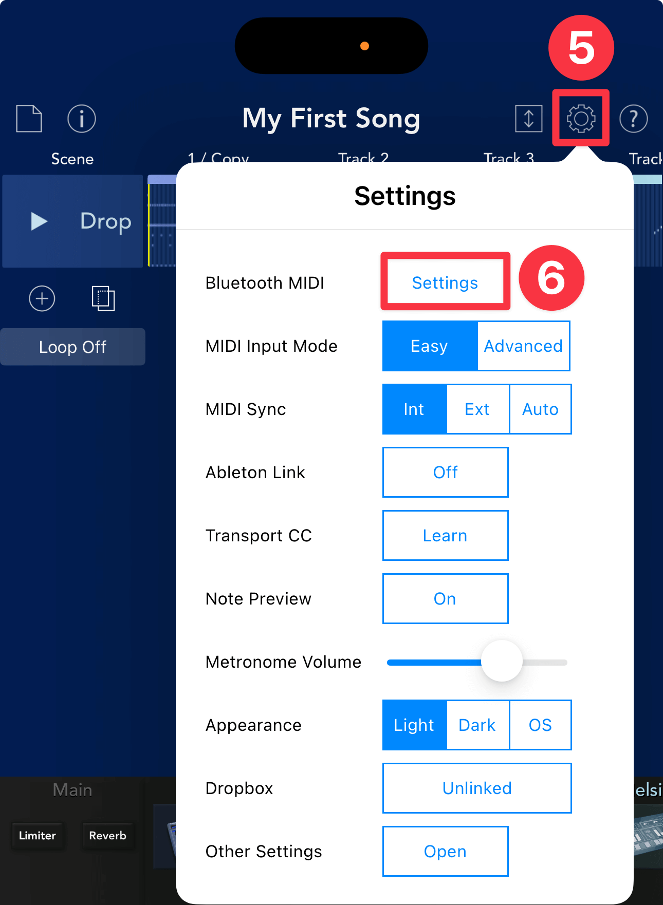 Open Settings ⑤ and tap Bluetooth MIDI ⑥. The KORG BM-1 will be recognized as a Bluetooth MIDI device, so tap it ⑦.