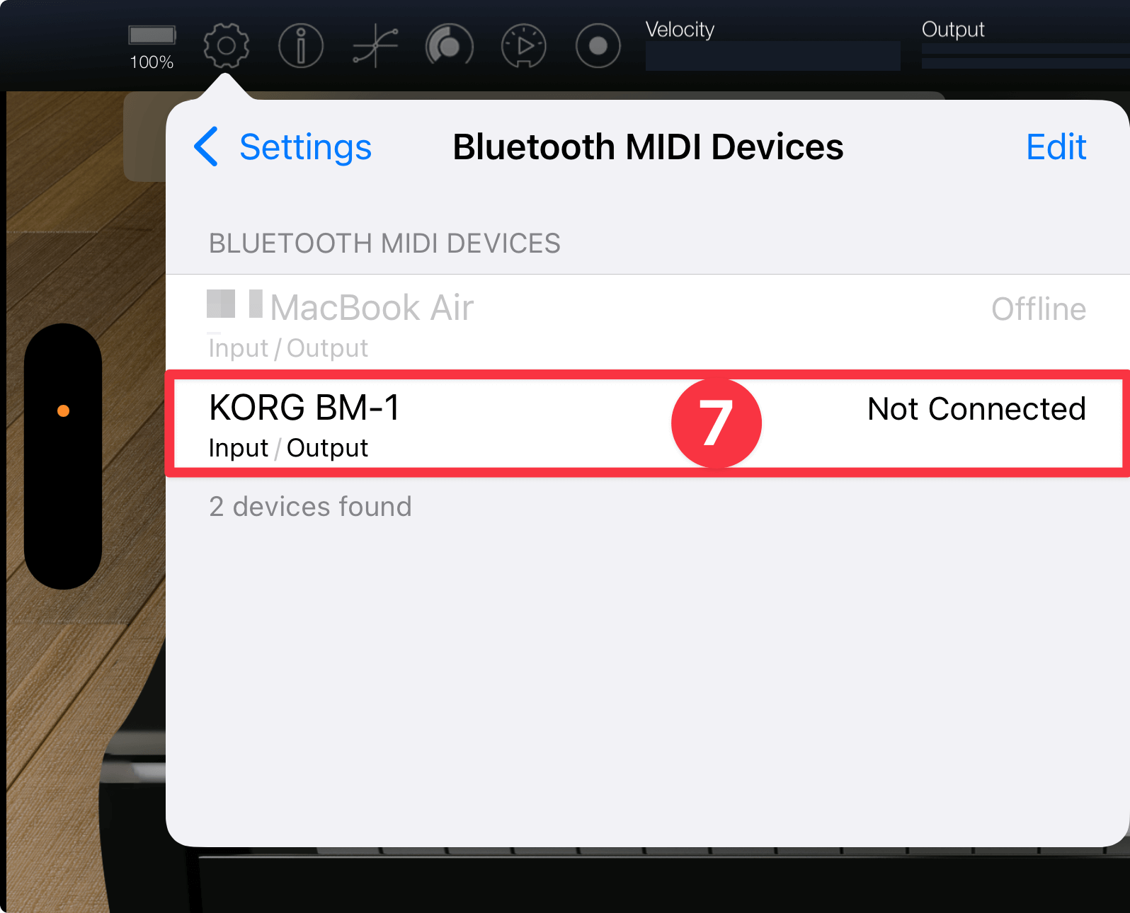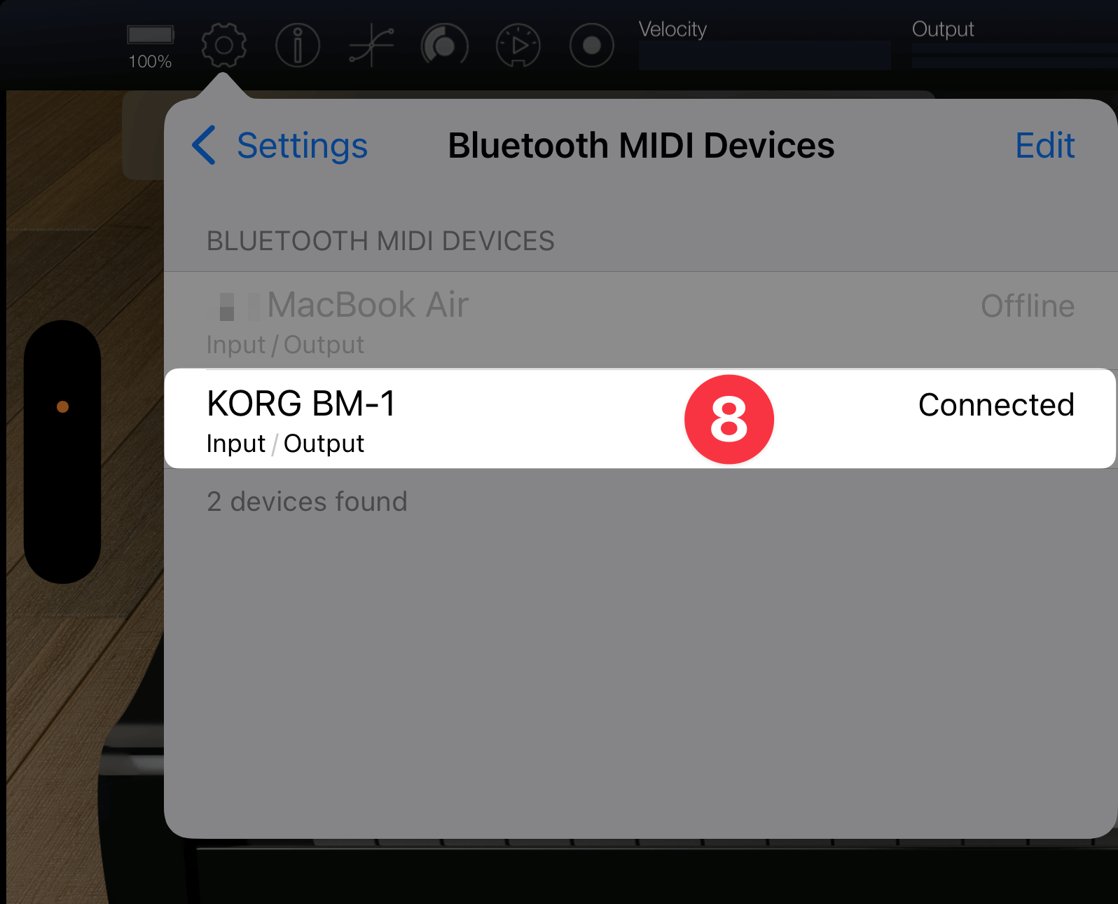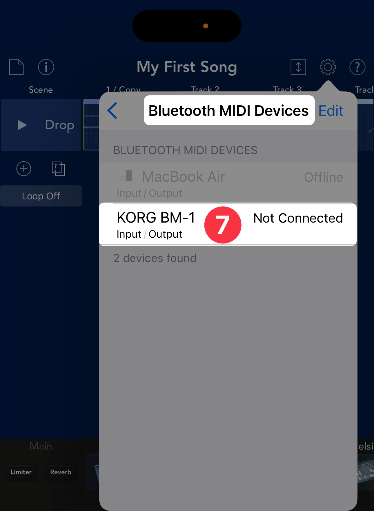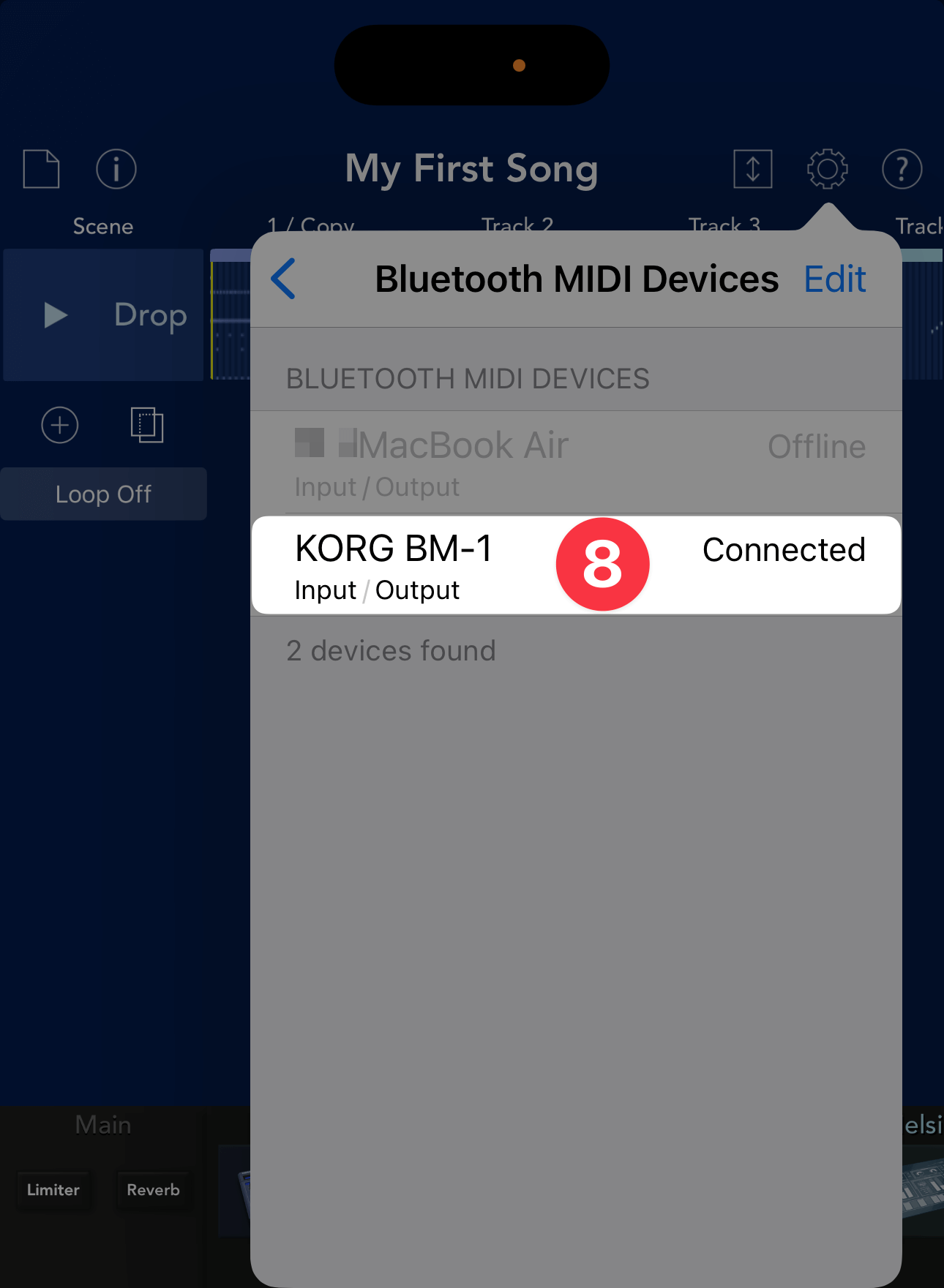 The KORG BM-1 will be detected as a Bluetooth MIDI device, so tapping "Not connected" ⑦ will change it to "Connected" ⑧.