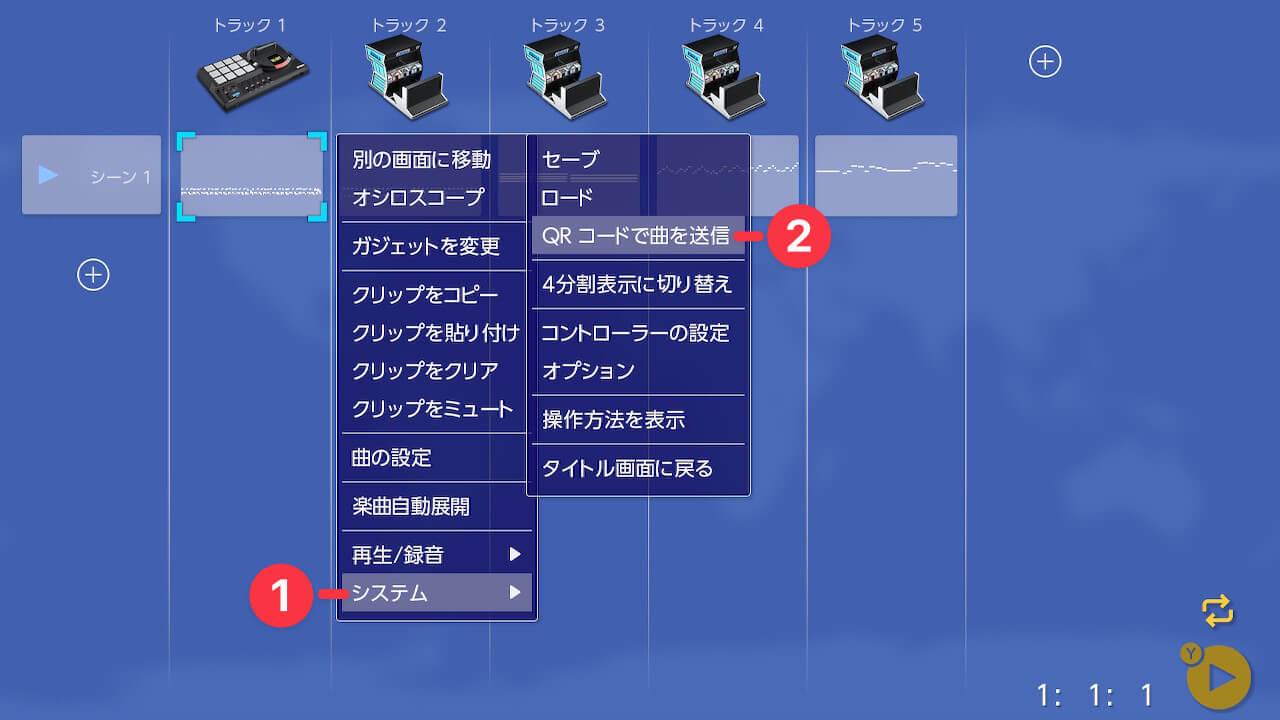 Switch版のメイン画面(オーバービュー)でXボタンを押し、表示されたメニューでシステム①→QRコードで曲を送信②を選択します。