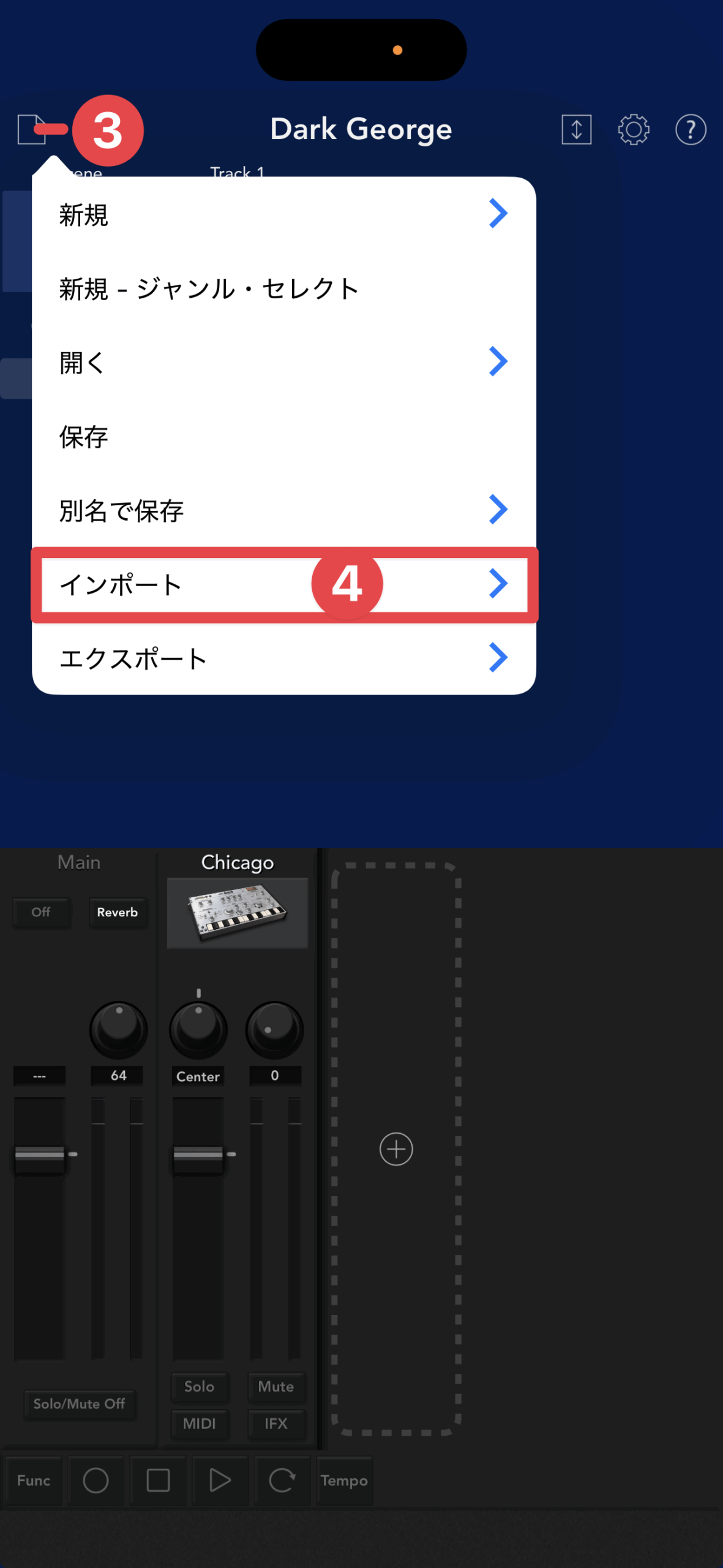 iOSデバイスのKORG Gadgetを起動して、ファイルボタン③→インポート④をタップ。
