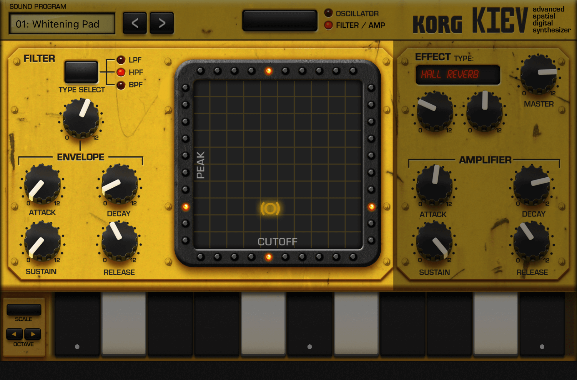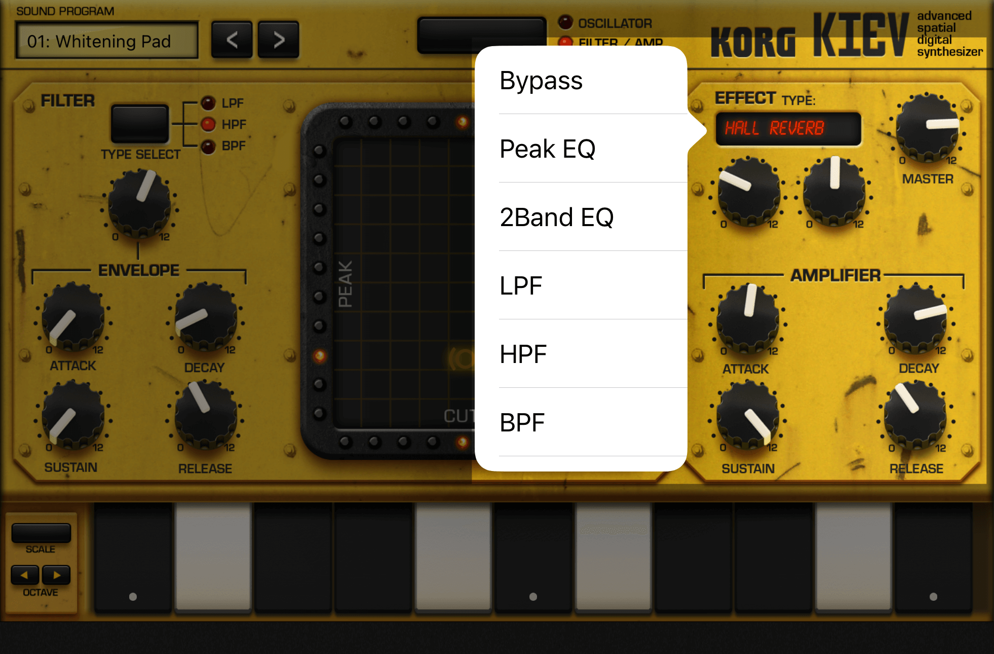 もうひとつの"FILTER / AMP"画面では、X-Yパッドでフィルターをかけることができます。EG(エンベロープ・ジェネレーター)もここにあります。