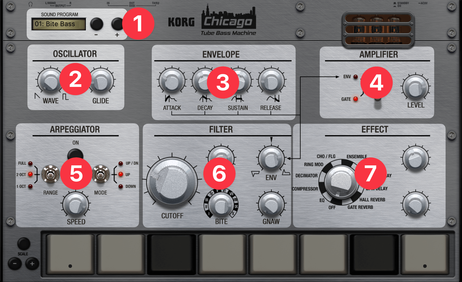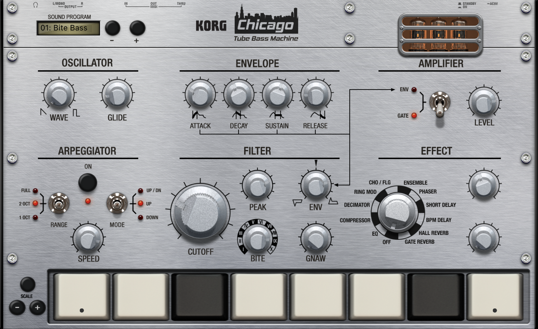 Chicagoの音作りは、オシレーターから出力される「ノコギリ波」と「矩形波」の比率をツマミで変えて、その先にあるフィルターで音色の明暗を定めつつ、アルペジエーターや内蔵FXでてサウンドを整えます。このようにChicagoはベースマシンですが、その素性はモノフォニック・シンセサイザーそのものです。