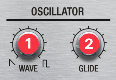 - OSC Waveform オシレーターから出力される基本波形を連続的に変える。-63〜+63の範囲で定め、ノブを下げ切るとノコギリ波に、上げるにつれて矩形波(くけいは)に近づく