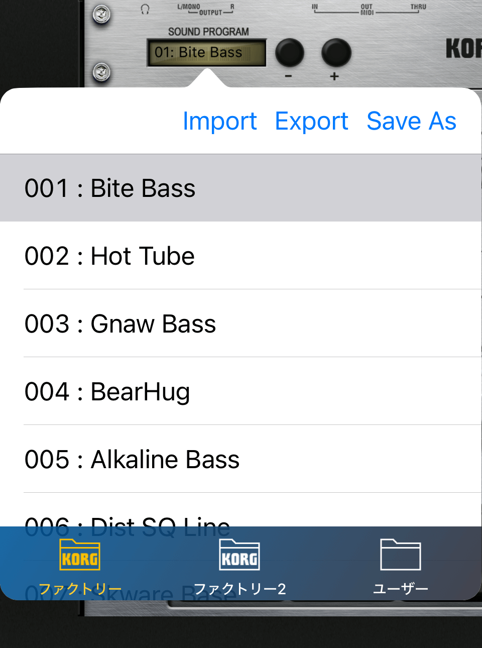タップするとプログラムを呼び出せます。ファクトリー2と合わせて81プログラム用意されています。