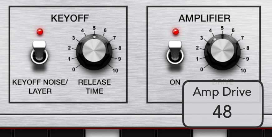 他にも、キーオフ後のノイズ量を調節できたり、サウンドをオーバードライブ気味に歪ませることもできます。