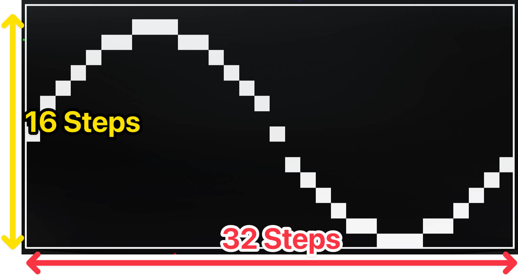 Kamataの元になった音源チップC30は4ビット/32サンプルのウェーブテーブルを持ちますから、Kamataでもこのように、波形1サイクルを縦軸16(=2の4乗)段階/横軸32段階で表現します。