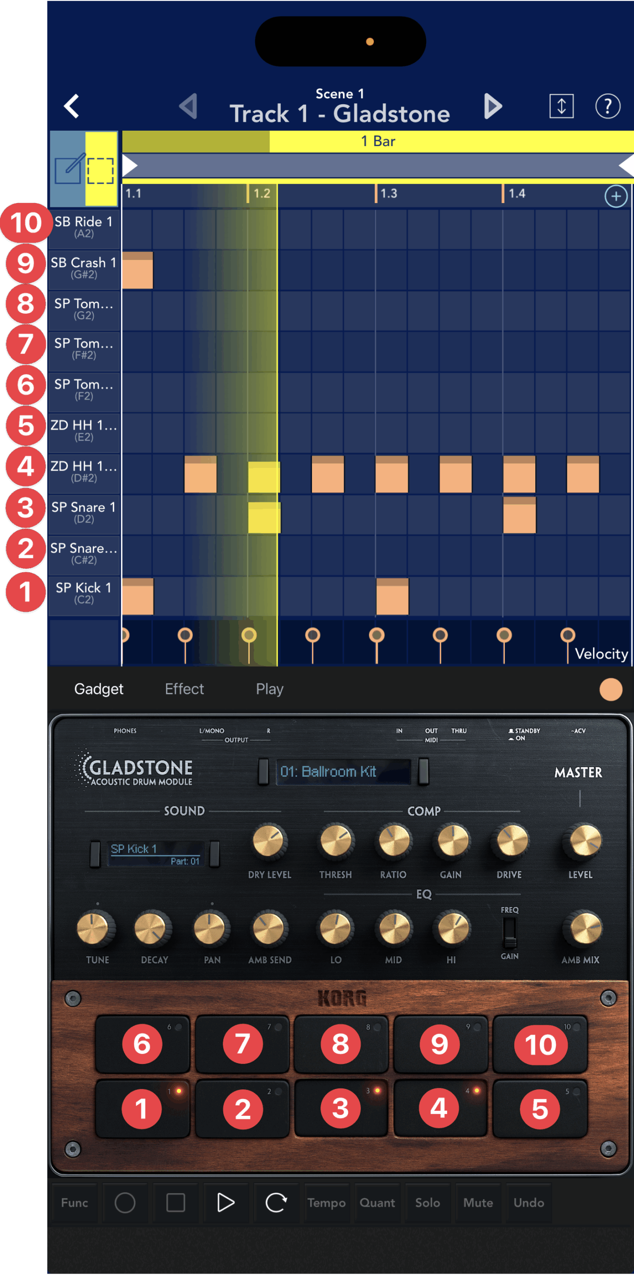 ガジェットパネルの下部にパッドが10個あり、ピアノロールのグリッドに対応します。