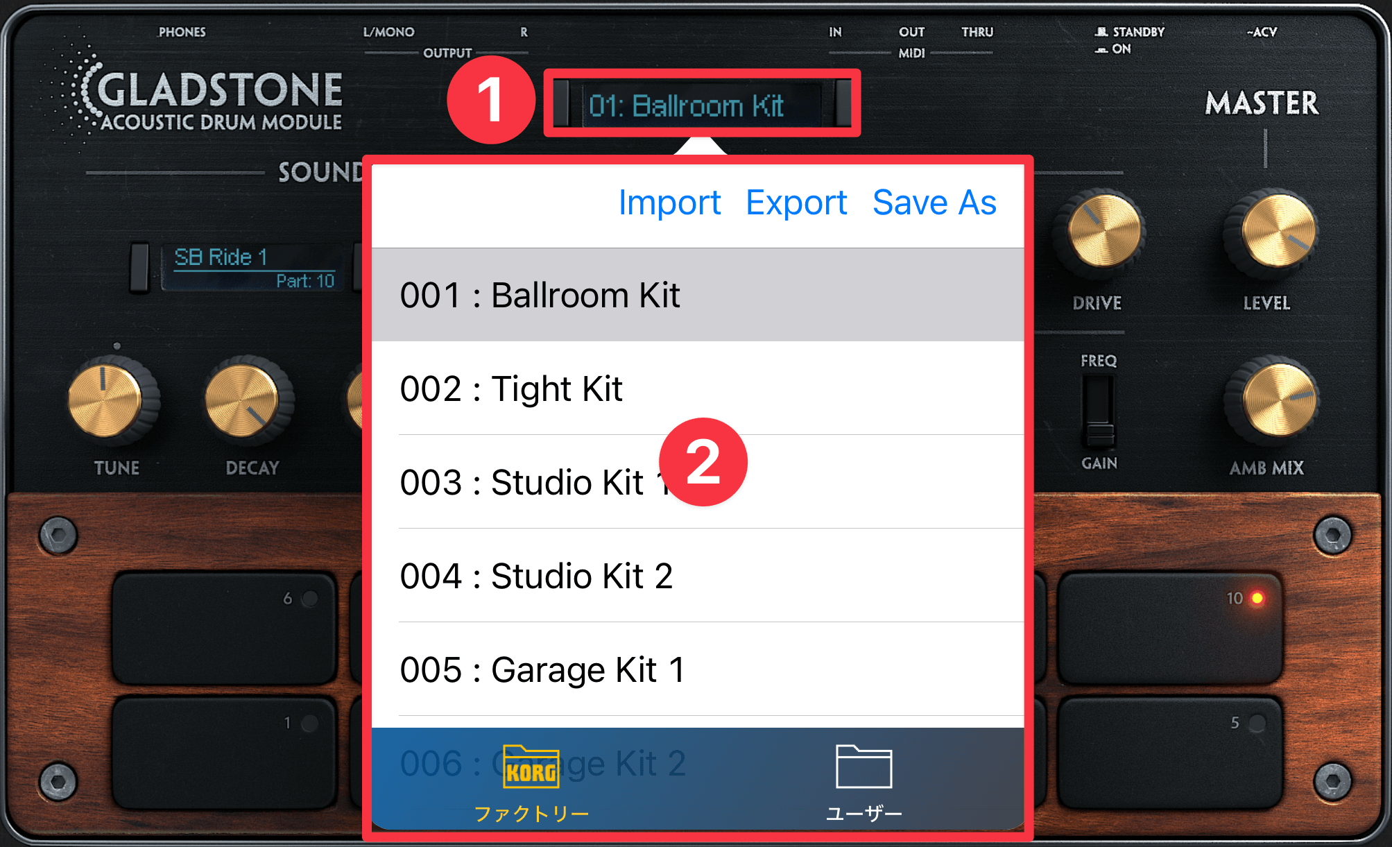 DRUM KIT①をタップすると、あらかじめプリセットされているドラムキットを呼び出すことができます②。