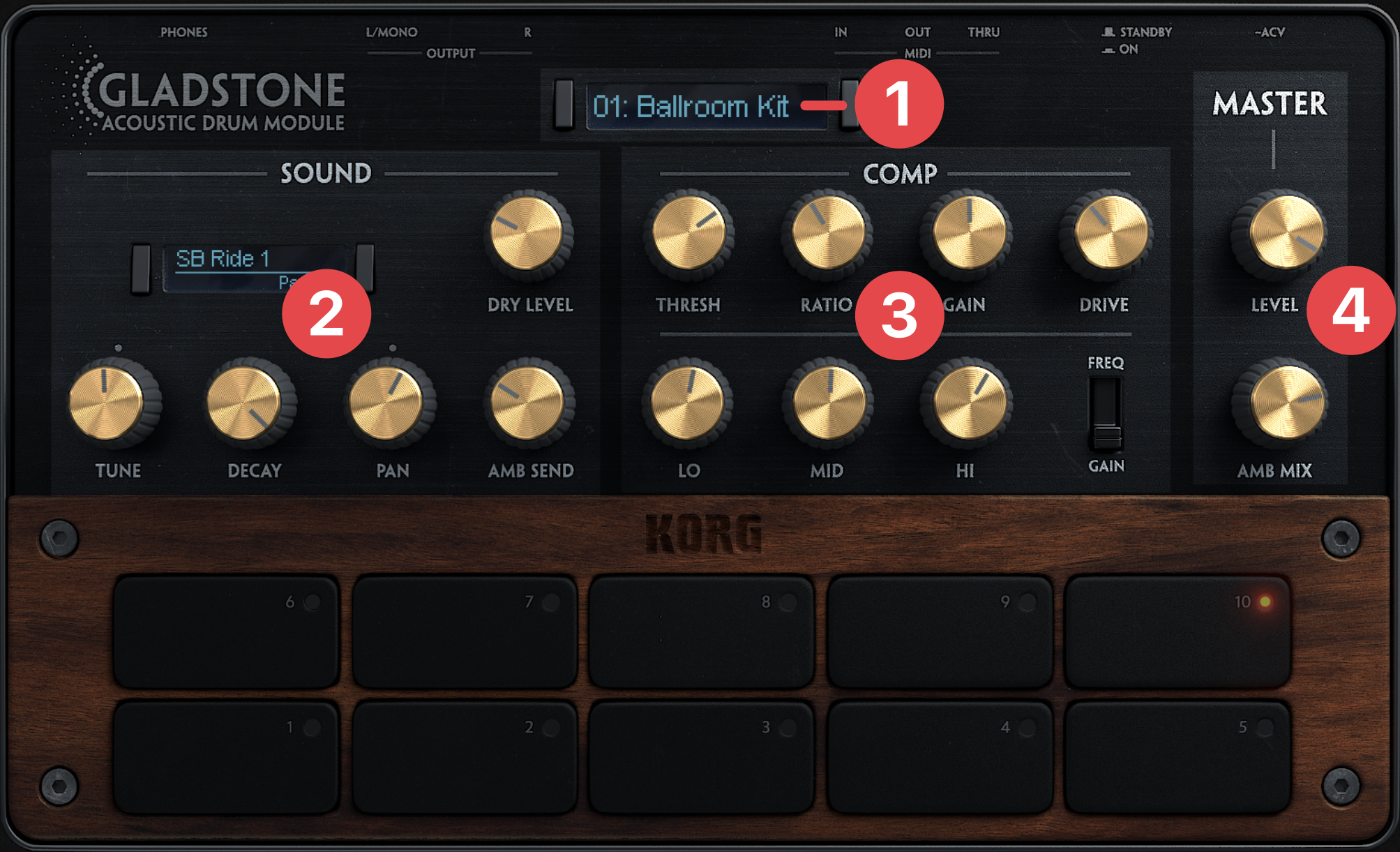 Gladstoneを使うときは、ドラムキット選びから始めるのが得策です。キット名にふさわしいプログラムがセットされ、適切なチューニングが施されているので、すぐに使うことができます。
