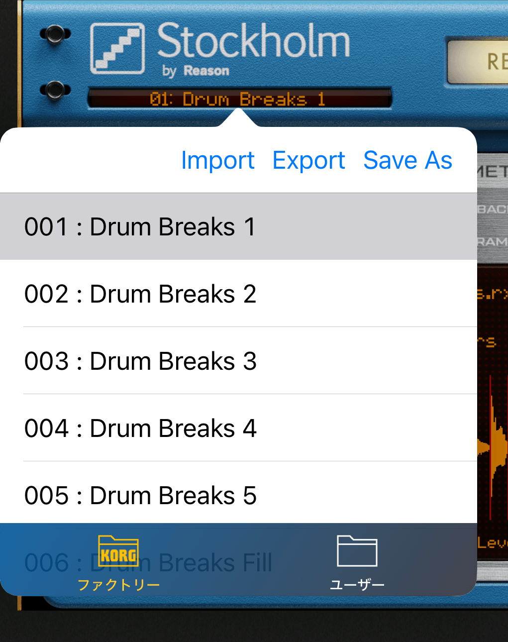 Stockholmのパッチ(REXループのセット)を呼び出すことができます。あらかじめ39種類がプリセットされてます。