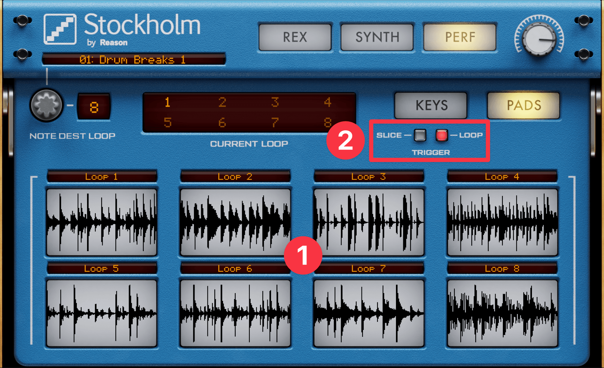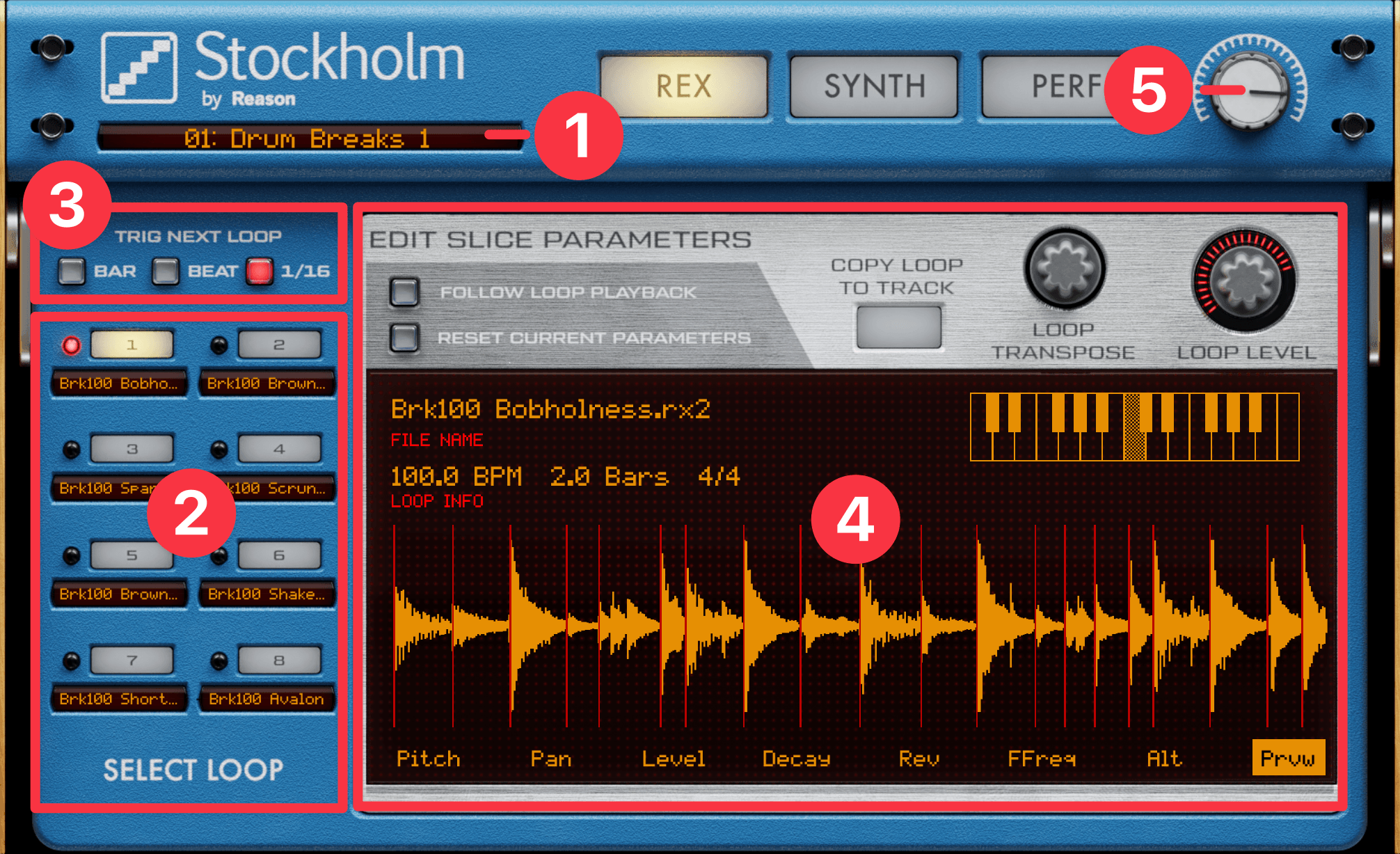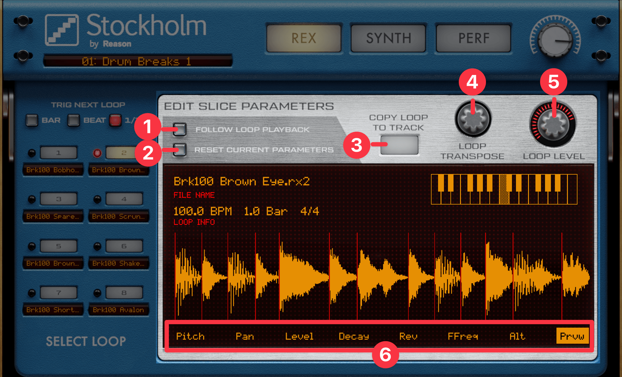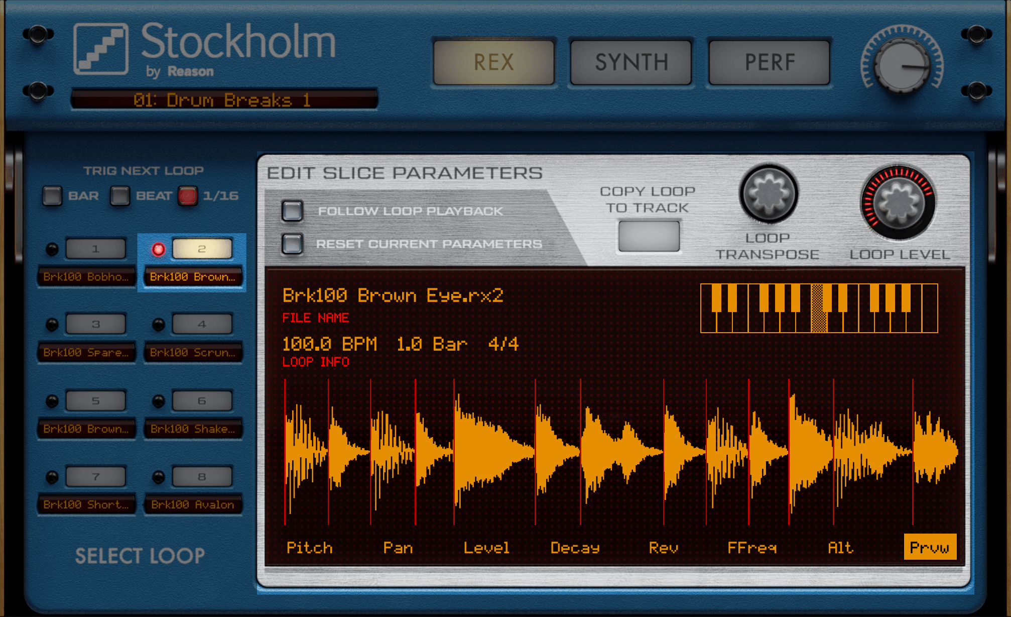 REX画面では、Rexループを8つまで呼び出して、スライスされた波形を細かくエディットできます。