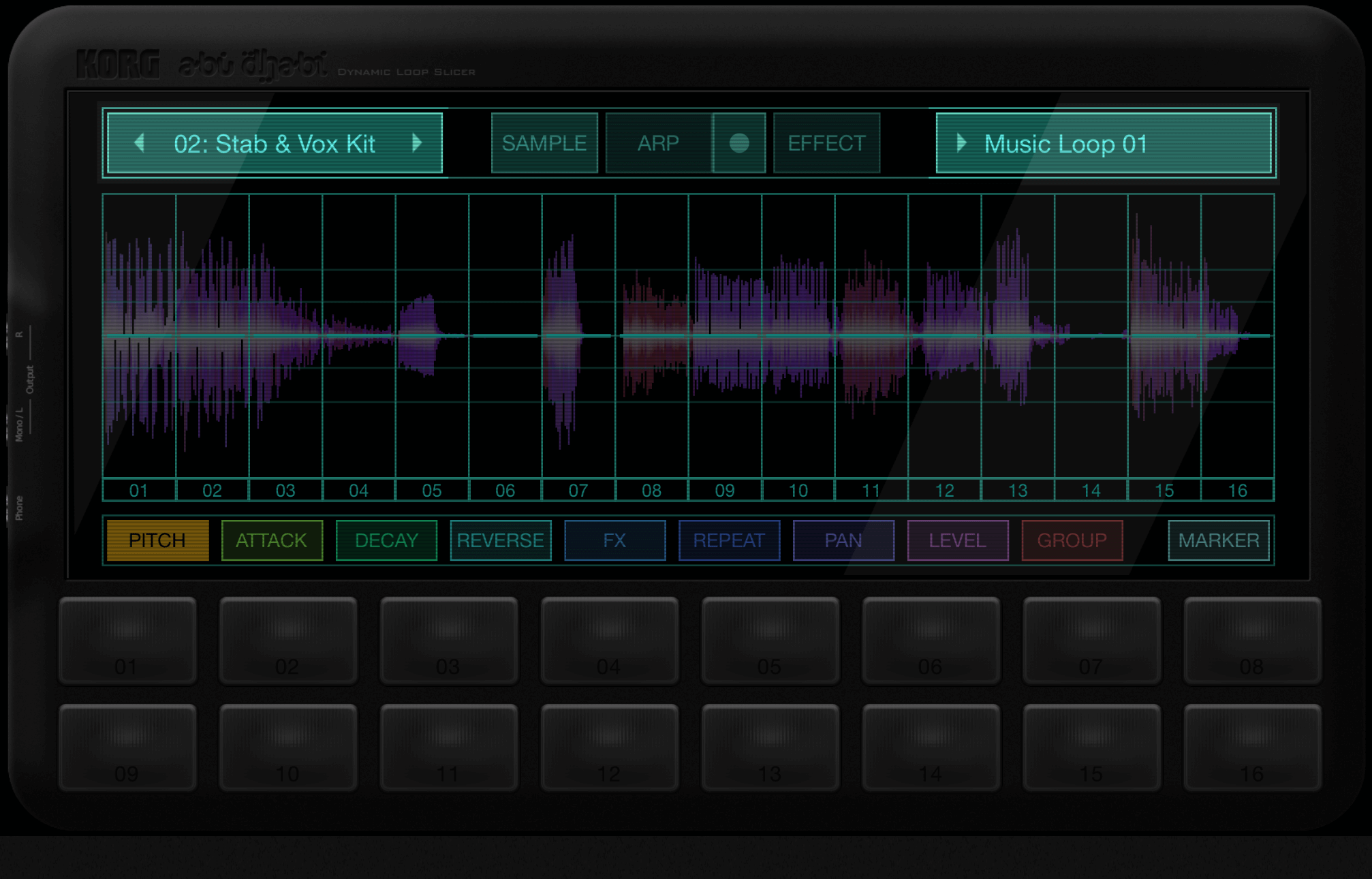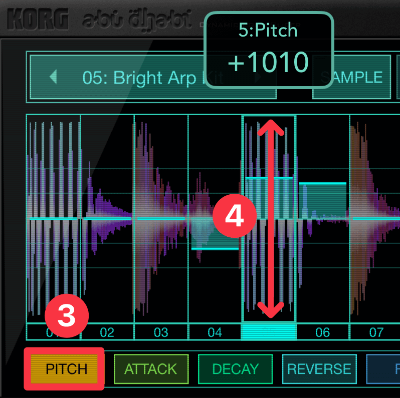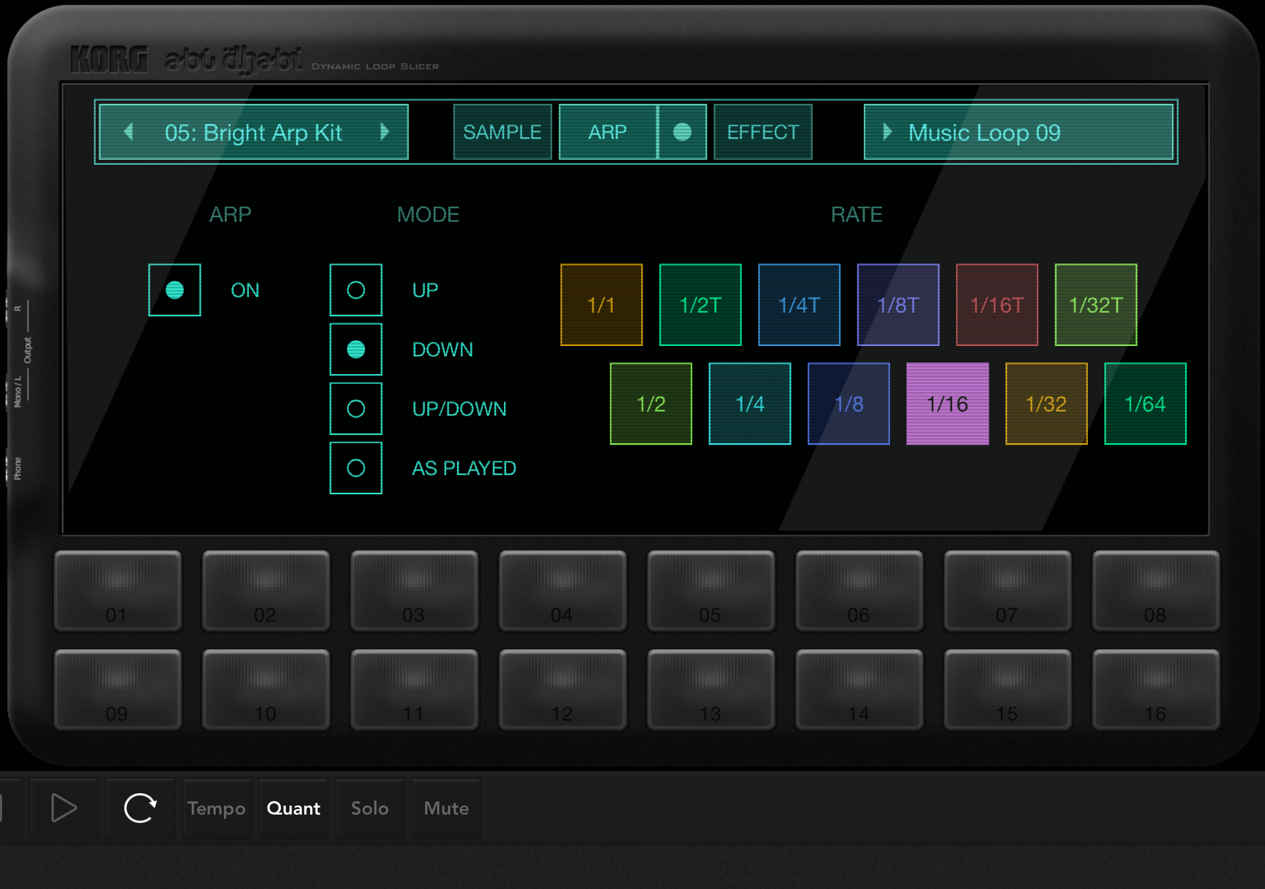 Abu Dhabiには、曲のテンポと同期する独自のアルペジエーターがあります。アルペジエーターは、同時に押さえたパッドのサンプルを繰り返し再生する機能です。