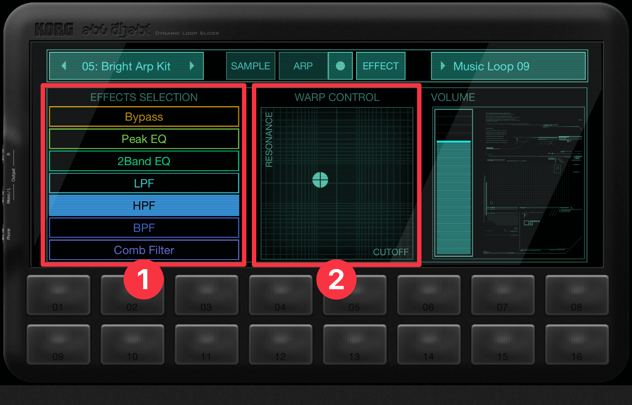 25種類ある内蔵FX①から一つを選び、"WARP CONTROL"②を操作してエフェクトをかけることができます。