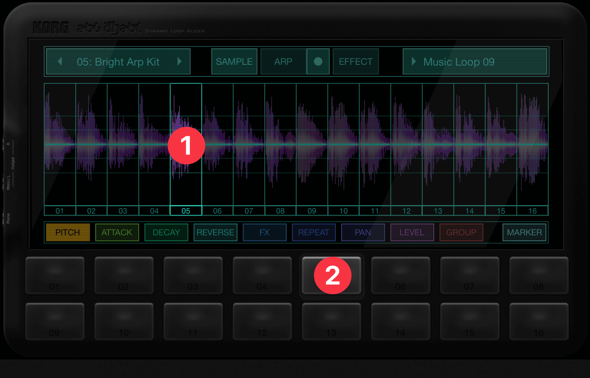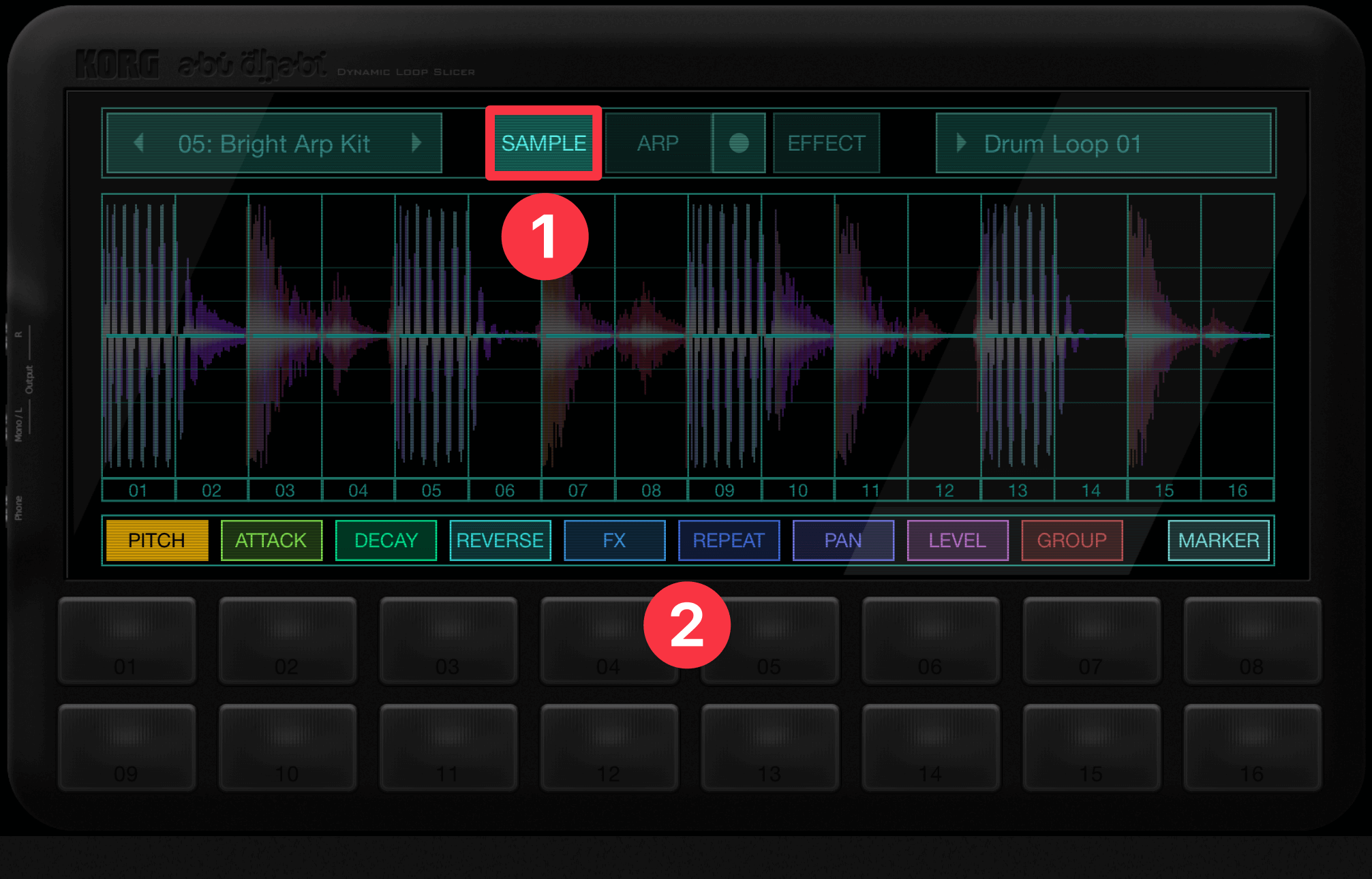 プログラムやオーディオファイルを読み込むと、16個のサンプルにスライスされます。スライスは自動的に行われますが、MARKER①をタップすると、ユーザーが位置を定めることができます②。