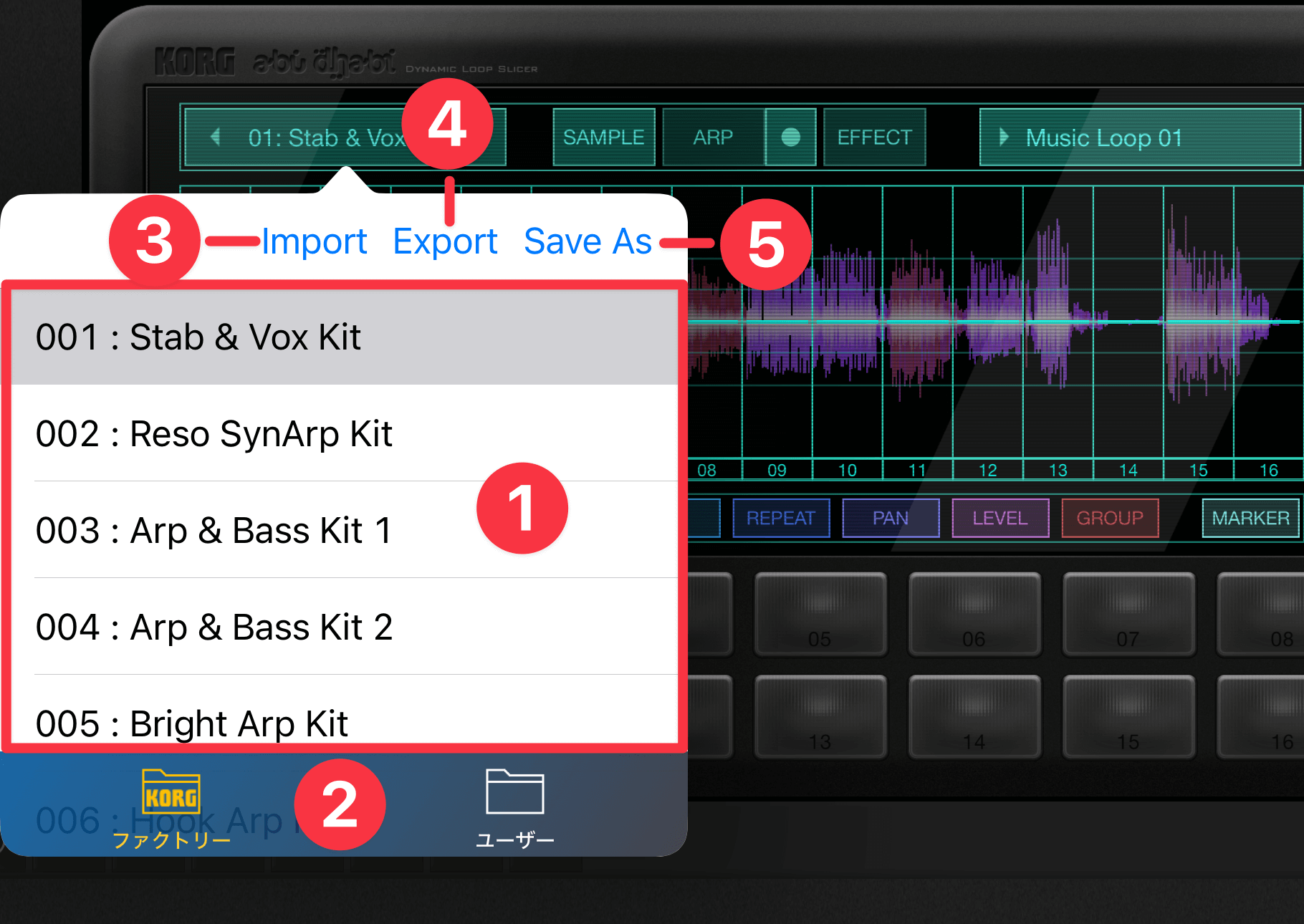 16個のサンプルに対応する16個のパッドがあります。たとえば"05"のサンプル①を鳴らしたいときは、パッド"05"②をタップすればOKです。