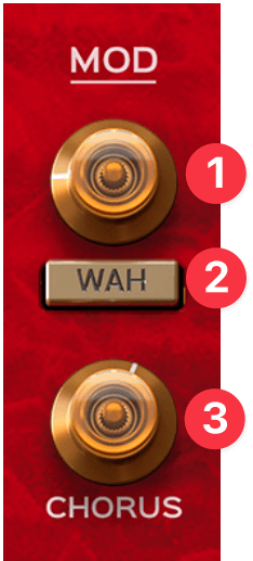 モジュレーション系(ワウとコーラス)の内蔵FXです。ワウは「ワウワウ」と喋っているような効果、コーラスは音に厚みを出す効果です。