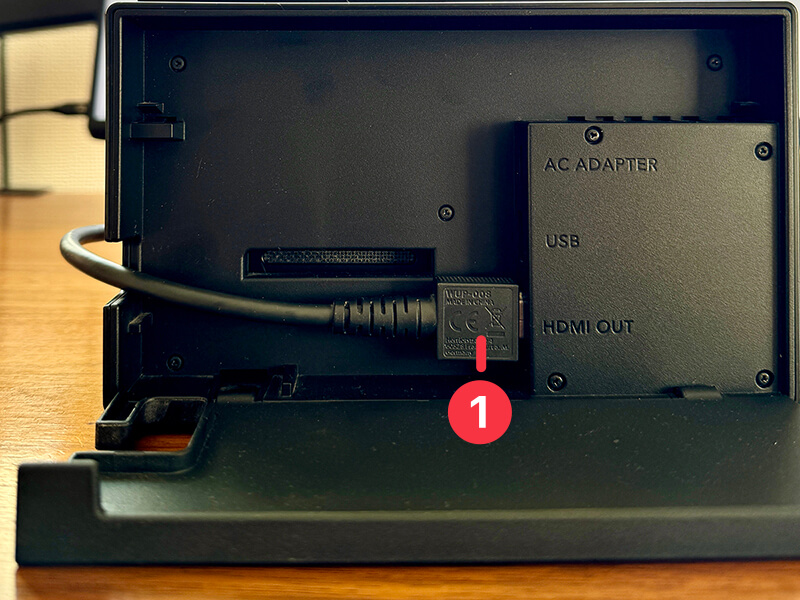 まずはNintendo Switchをドックにセットします。そしてHDMIケーブルをドック背面にあるHDMI OUTにつなぎ①、もう一方をキャプチャーボードにつなぎます②。