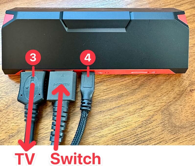 さらに「HDMIケーブル2」をゲームレコーダーのHDMI OUT③につないで、モニターやTVと接続します。ちなみにmicroUSB④は給電用です。