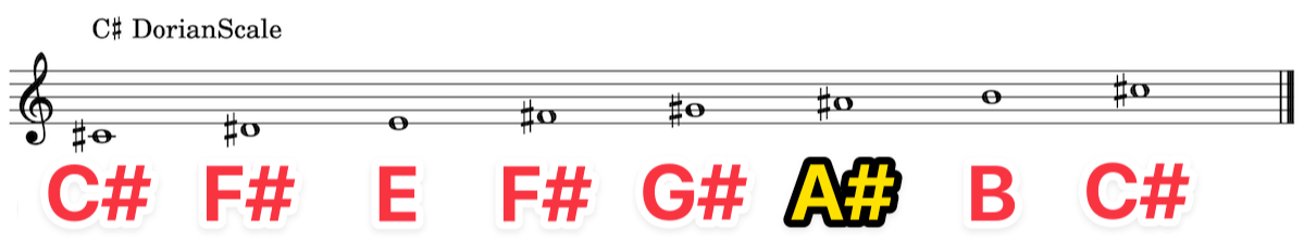 チュートリアルのデモソングはC#ドリアン・スケールなので、特性音は6つめの音であるA#になります。