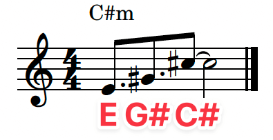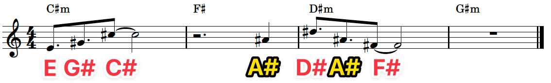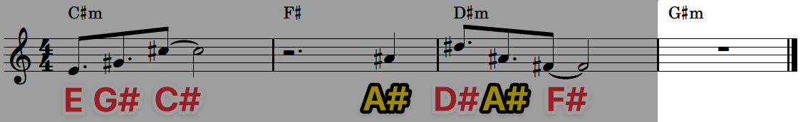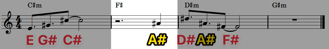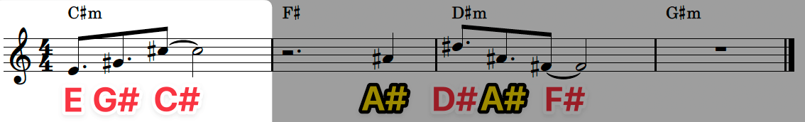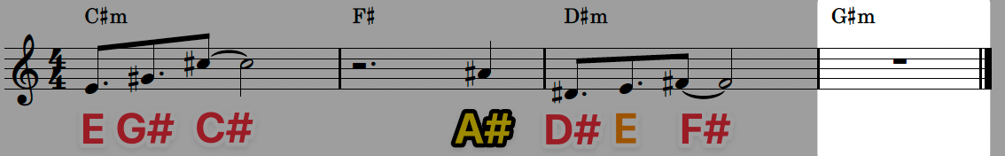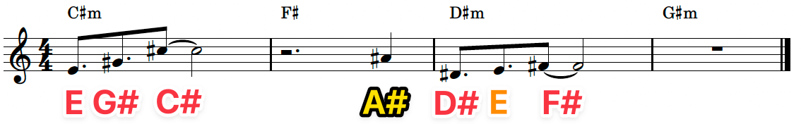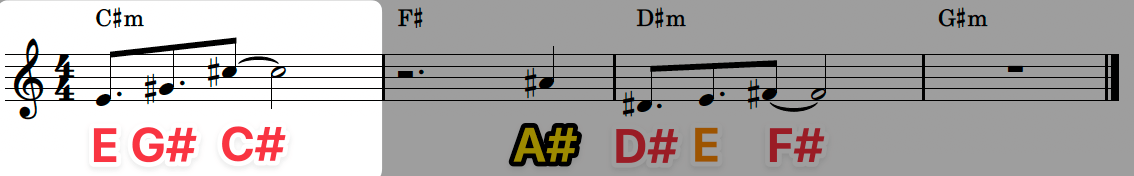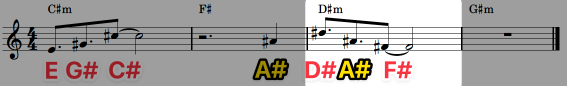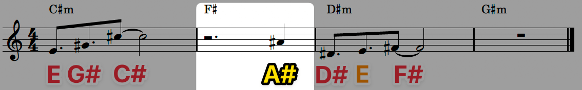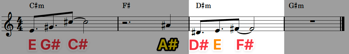 ちなみに3 BarにあるEは、コードD#m(D#,F#,A#)には含まれない音です。しかしスケール内の音であり、こうして経過的に使うのはむしろ有効です。