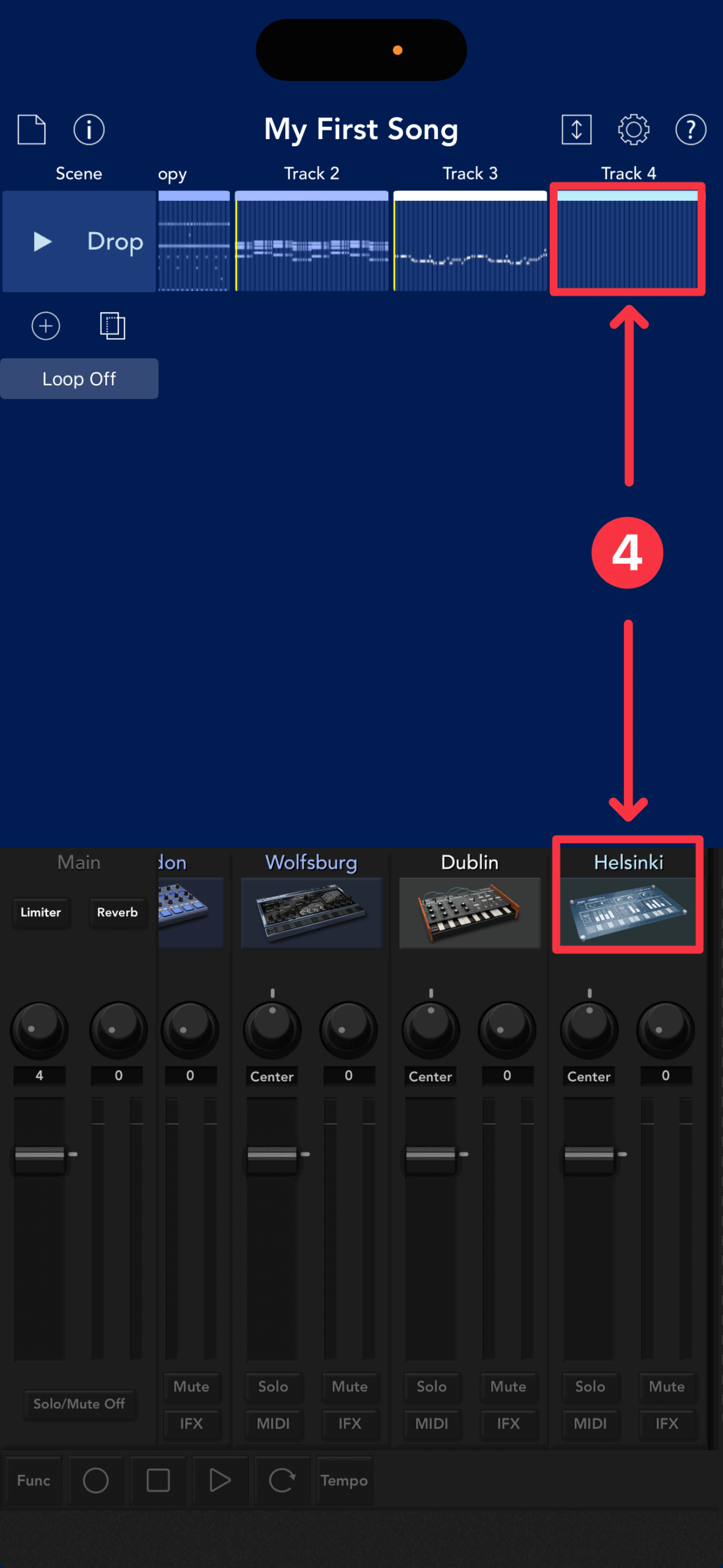 Track 4のクリップ、またはガジェットアイコンをタップ④し、エディット画面⑤に移りましょう。