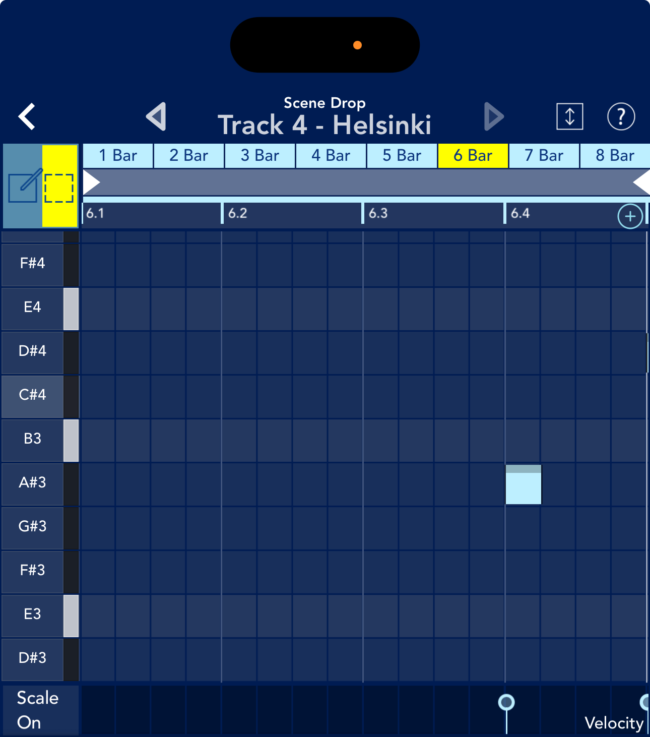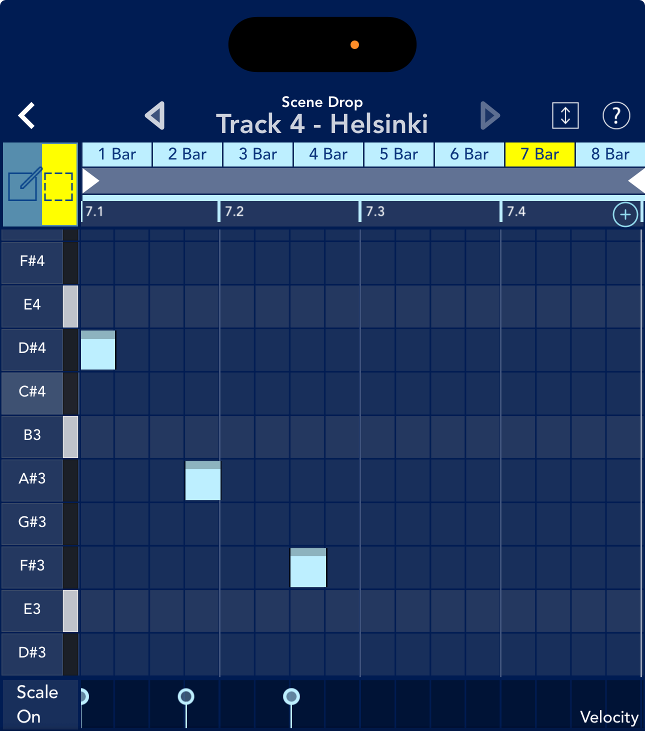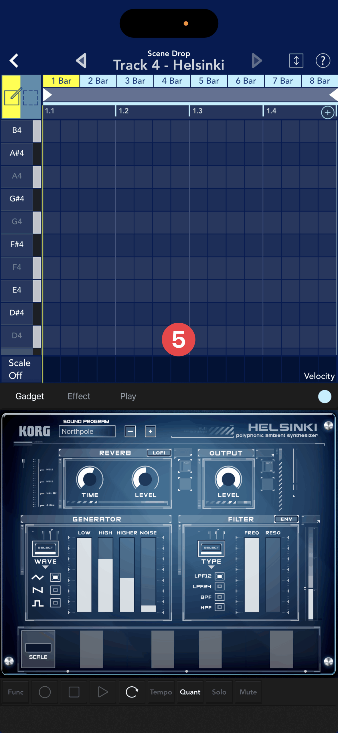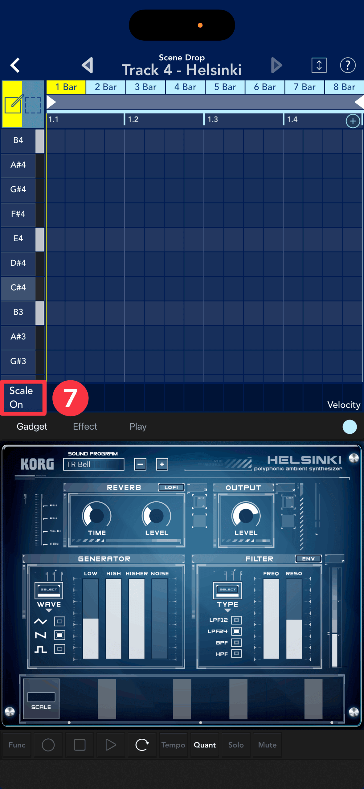 HelsinkiのSOUND PROGRAMをタップし、11: TR Bell⑥を選んでください。そして、ピアノロールをScale On⑦にするのをお忘れなく。