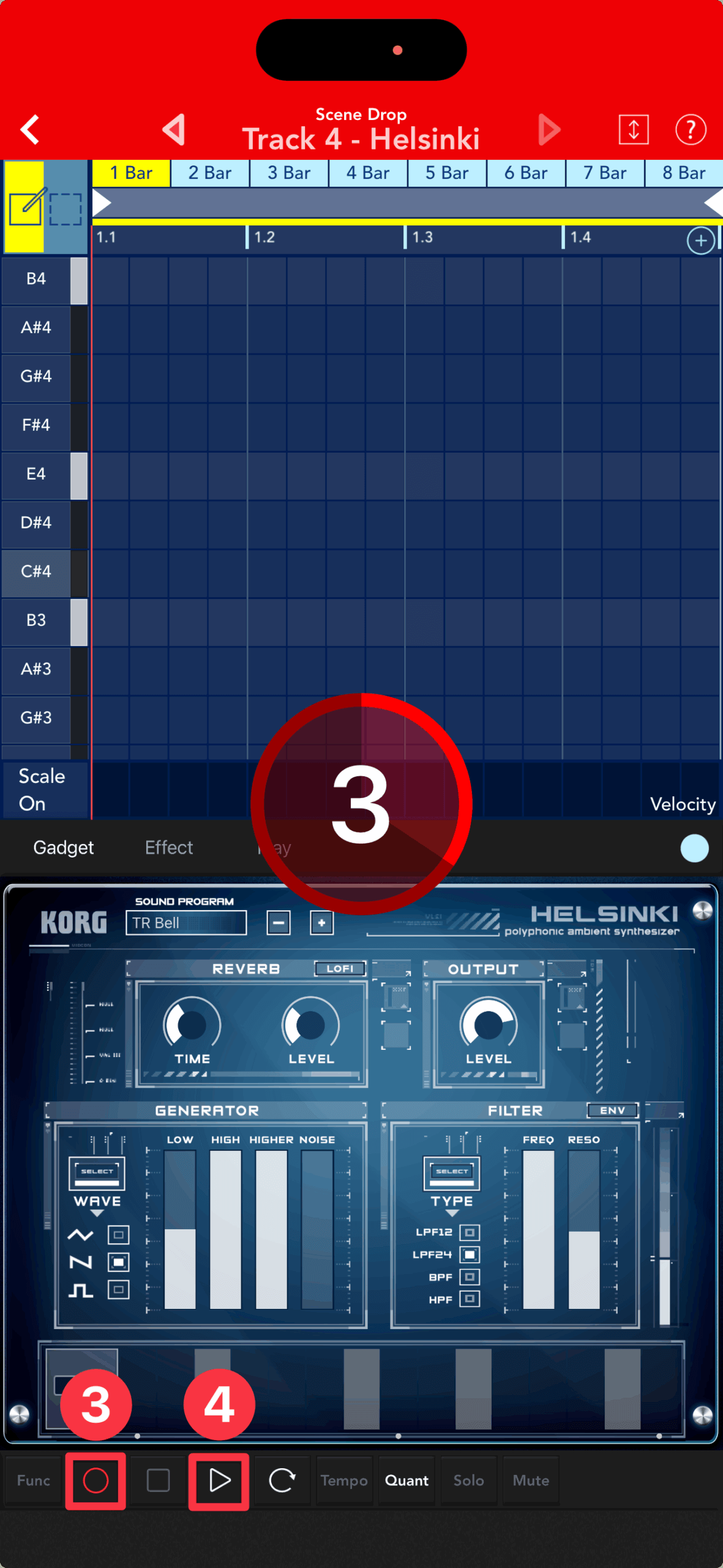 リアルタイム入力を行います。Recボタン③をタップすると、画面上部が赤く光ってスタンバイ状態になります。続けてPlayボタン④をタップすると、カウントダウン後にレコーディングが始まります。タイミングよく打ち込みましょう。