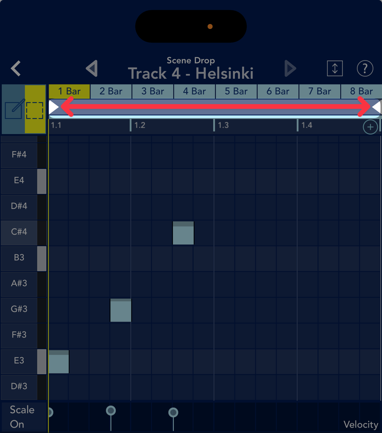 ピアノロール最上位を見ると、▶︎と◀︎マークがあります。このマークで囲まれたBarがループ再生されます。