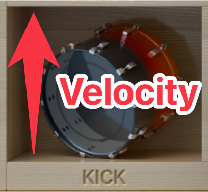 パッドの下エリアを叩くと小さく、上エリアに行くにつれベロシティーが大きくなります。これはリアルタイム・レコーディング時に役立つでしょう。