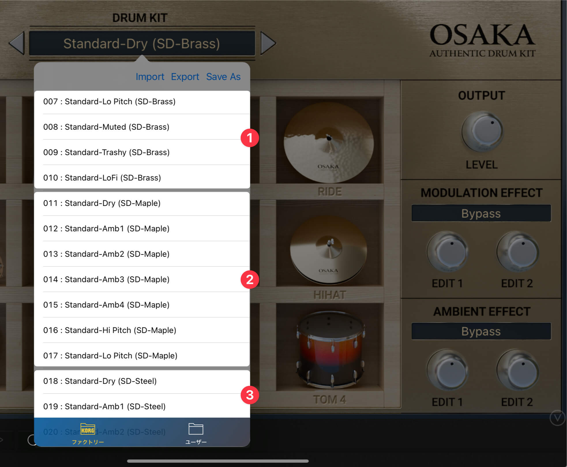 Osakaに標準搭載されたドラムキットは"Standard"だけで、基本的にはスネアの材質(Brass① / Maple② / Steel③)と、アンビエントのキャラクターでプリセットを選ぶことになります。