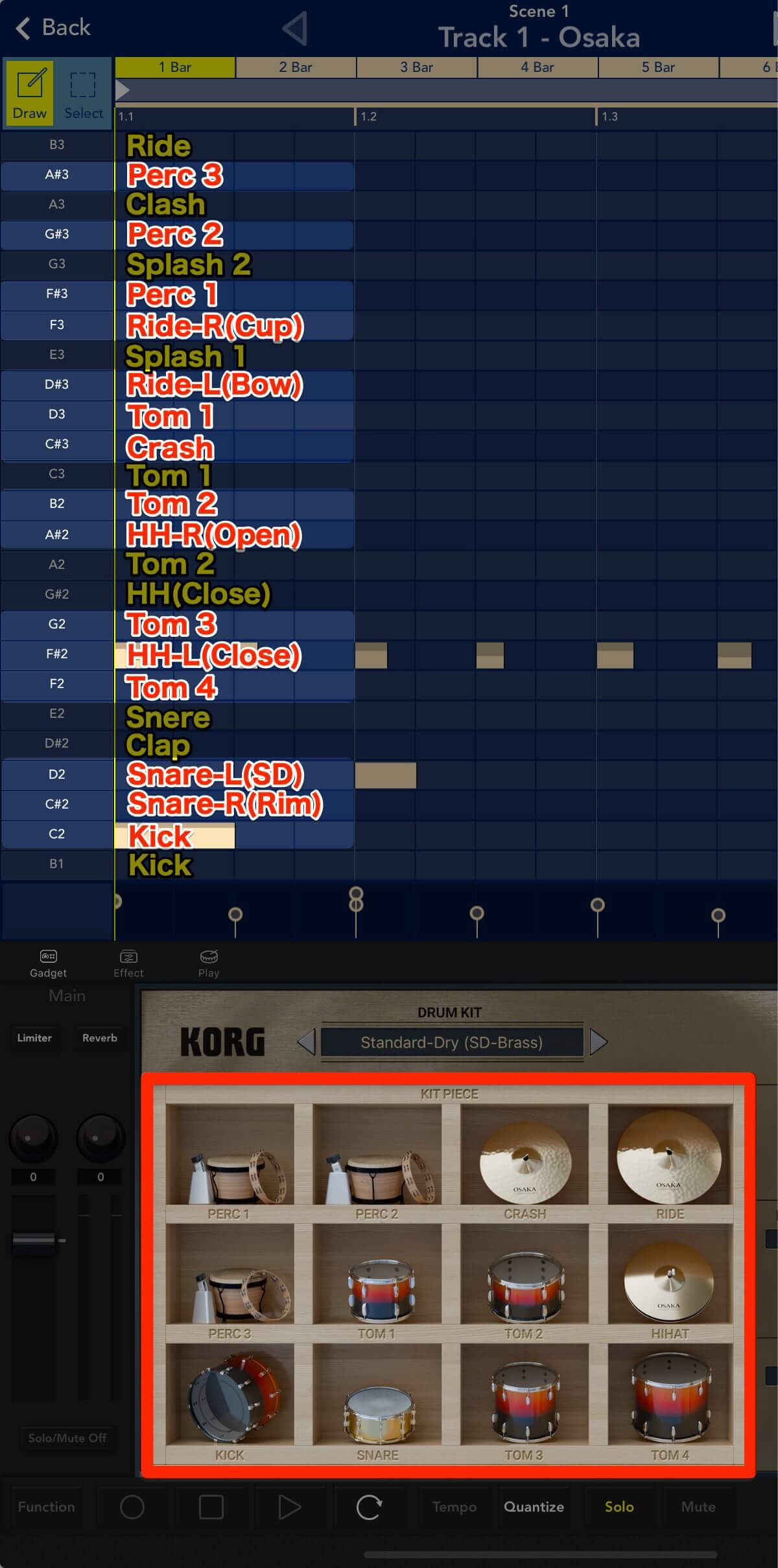 Osaka(大阪)は、KORG Moduleのアコースティック・ドラムをガジェット化したもの。