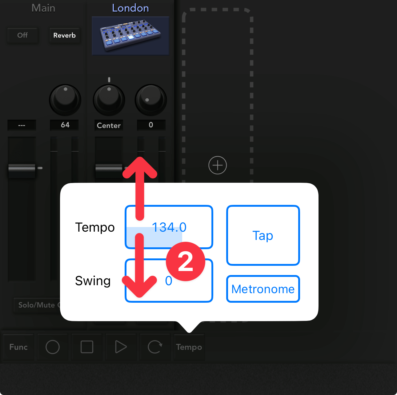 Tempoのところで上下ドラッグ②すると、値を連続的に上げ下げできます。