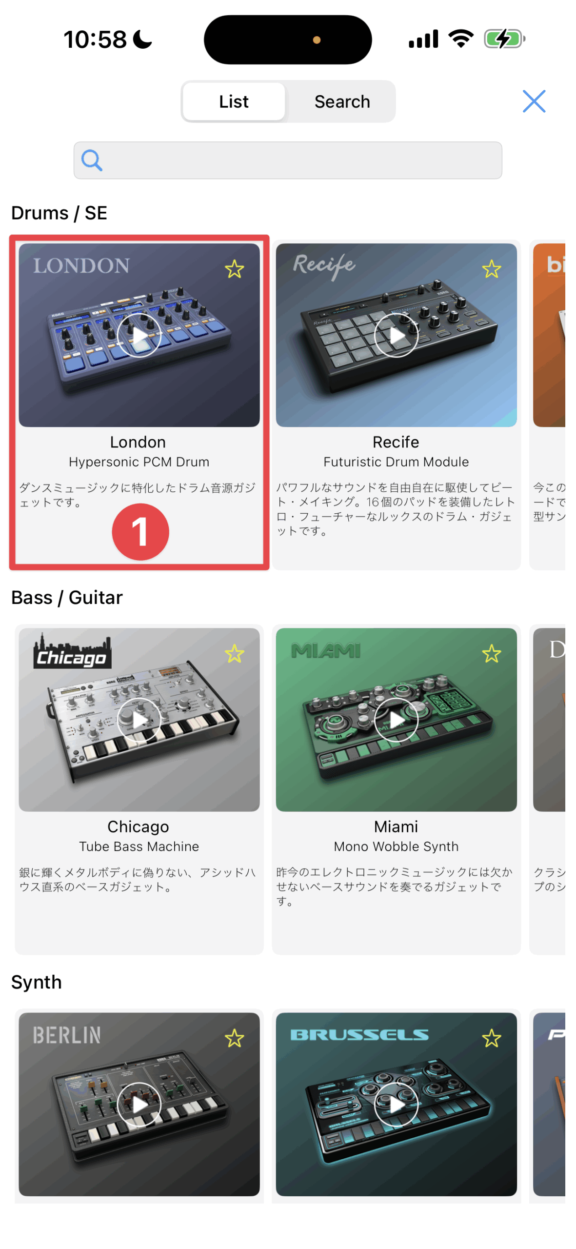 新しいプロジェクトを作ると、すぐにガジェットブラウザが起動します。一番上にあるカテゴリーDrums/SEにあるLondon①をタップしてください。