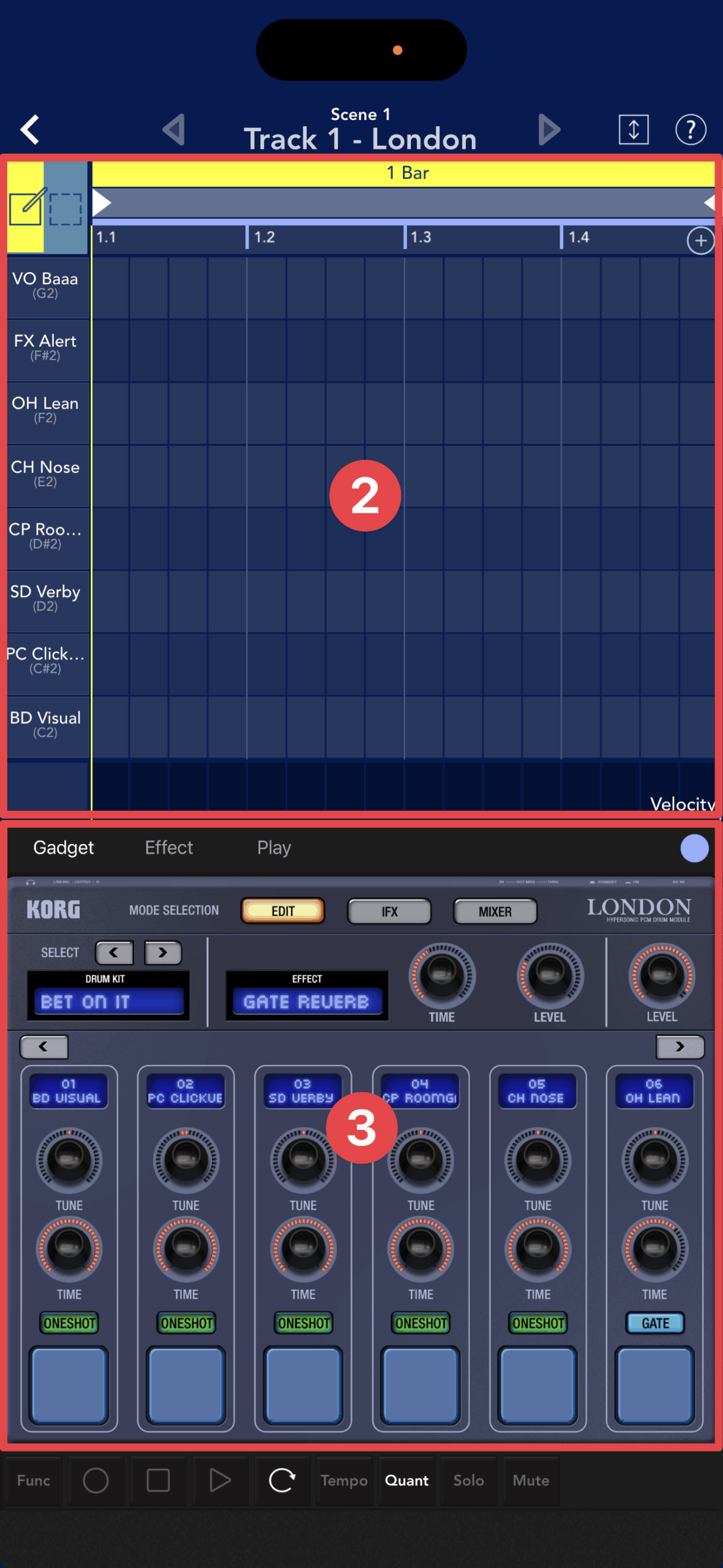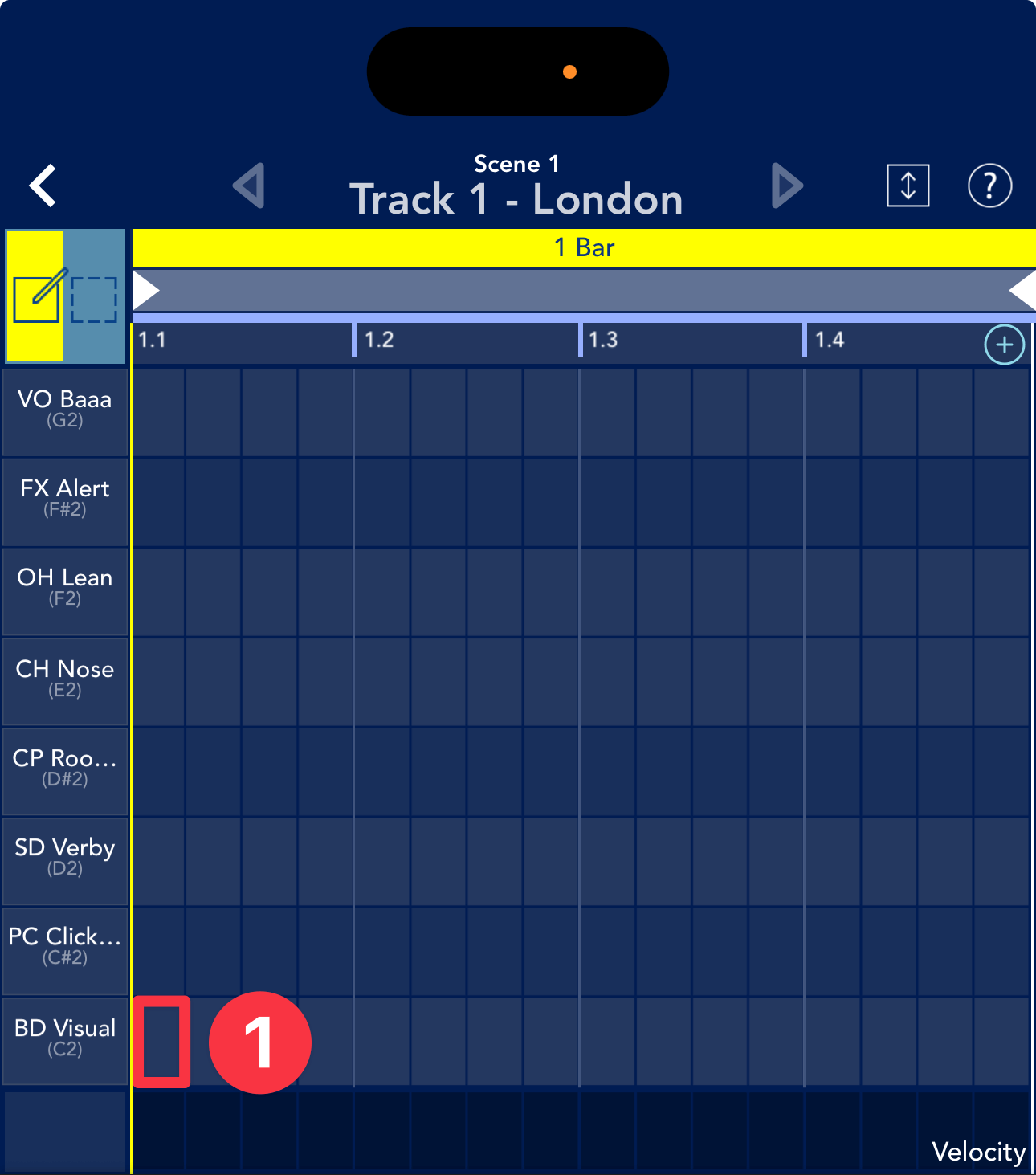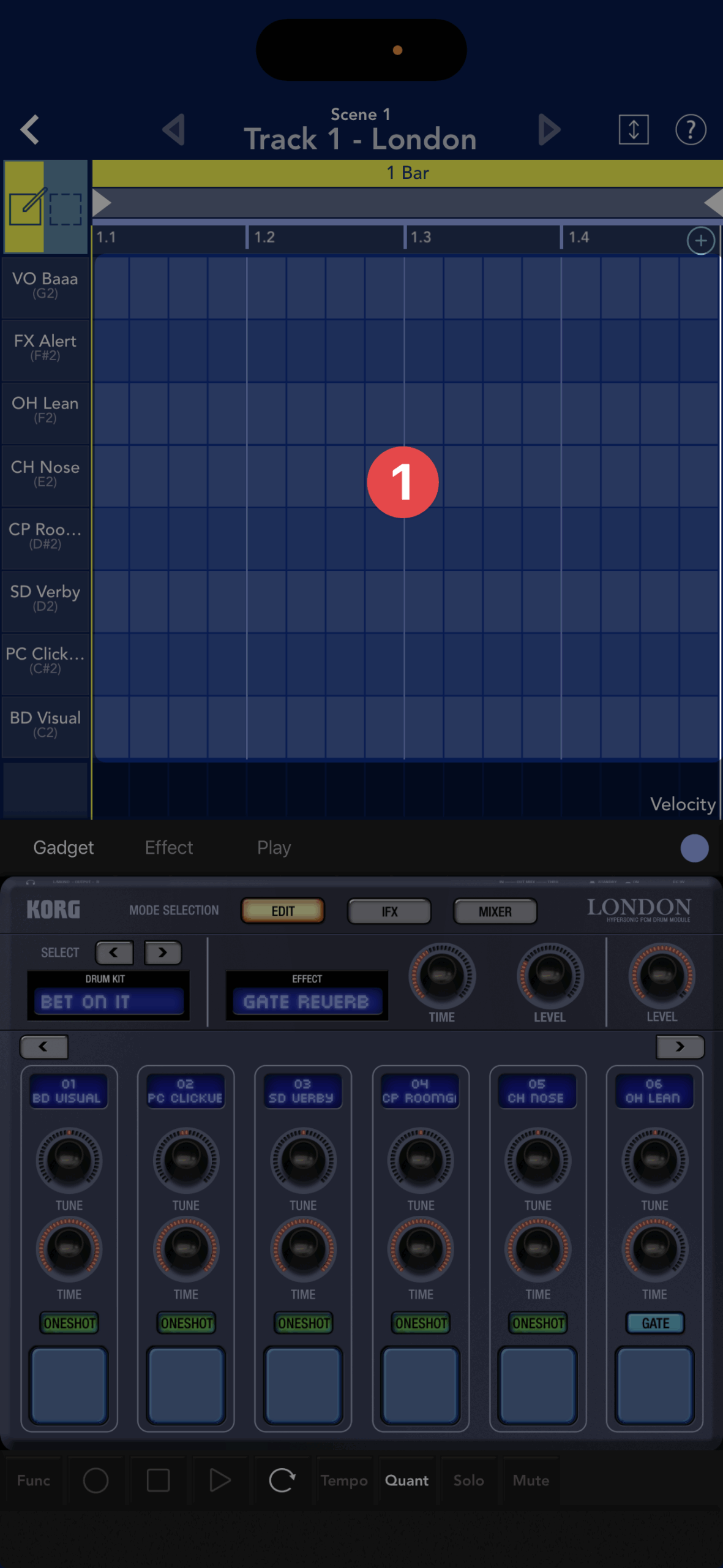 メイン画面で、Track 1のクリップまたはガジェットアイコン①をタップすると、演奏データの入力をおこなうエディット画面に切り替わります。
