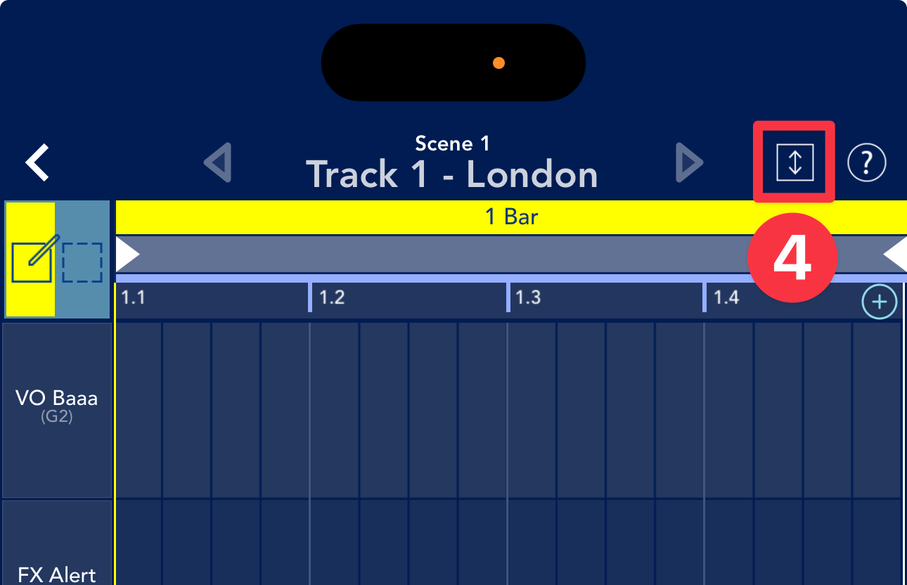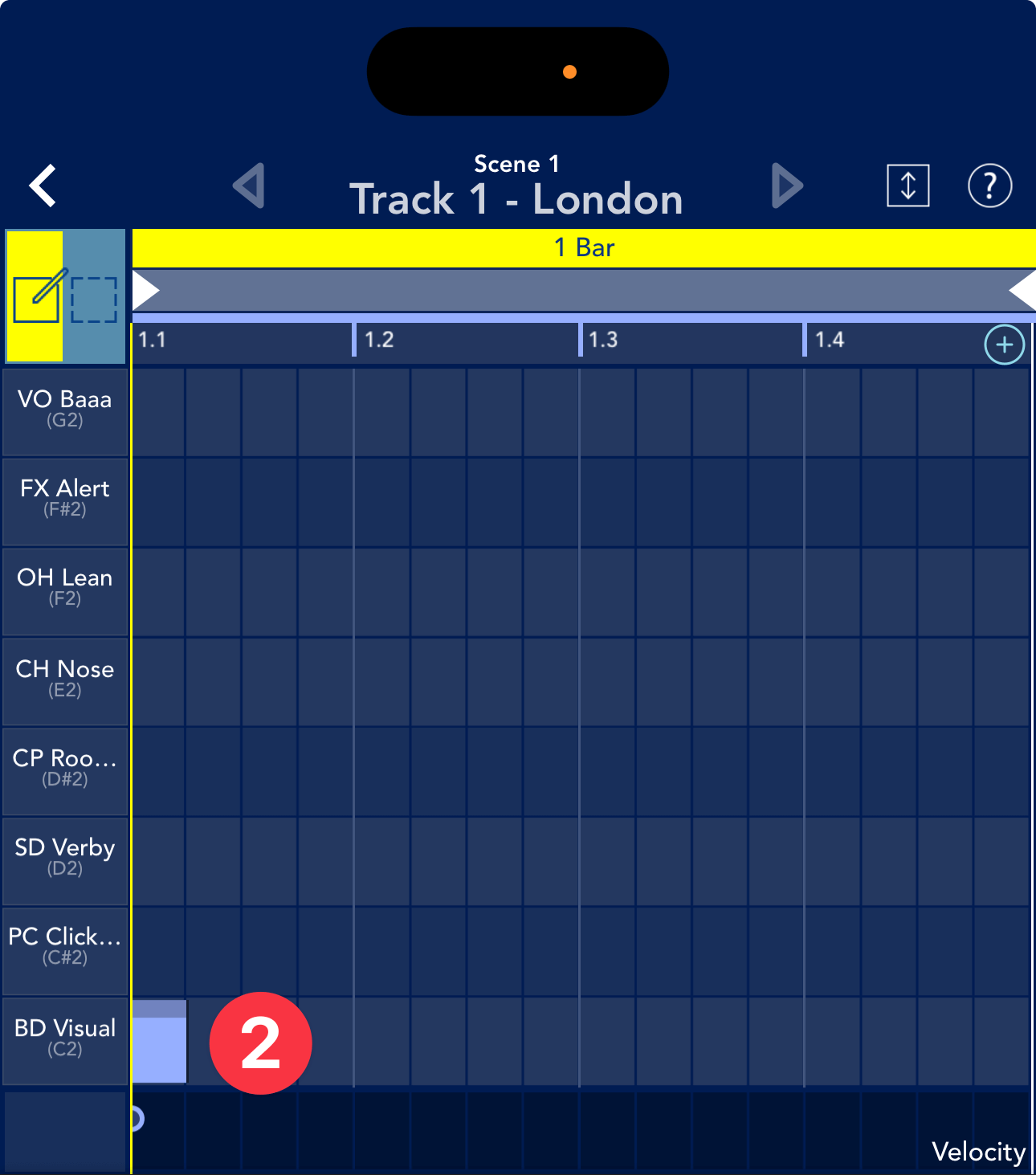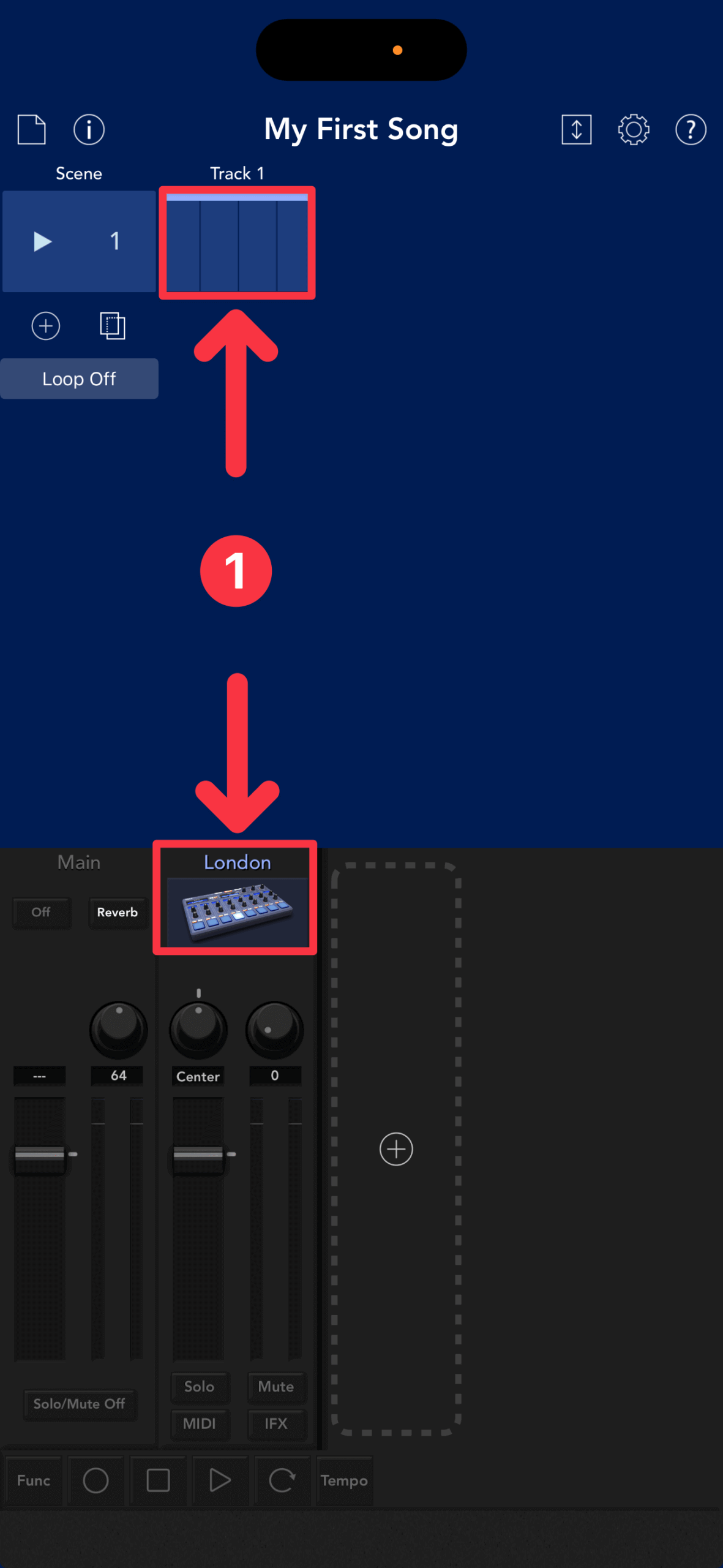 メイン画面で、Track 1のクリップまたはガジェットアイコン①をタップすると、演奏データの入力をおこなうエディット画面に切り替わります。