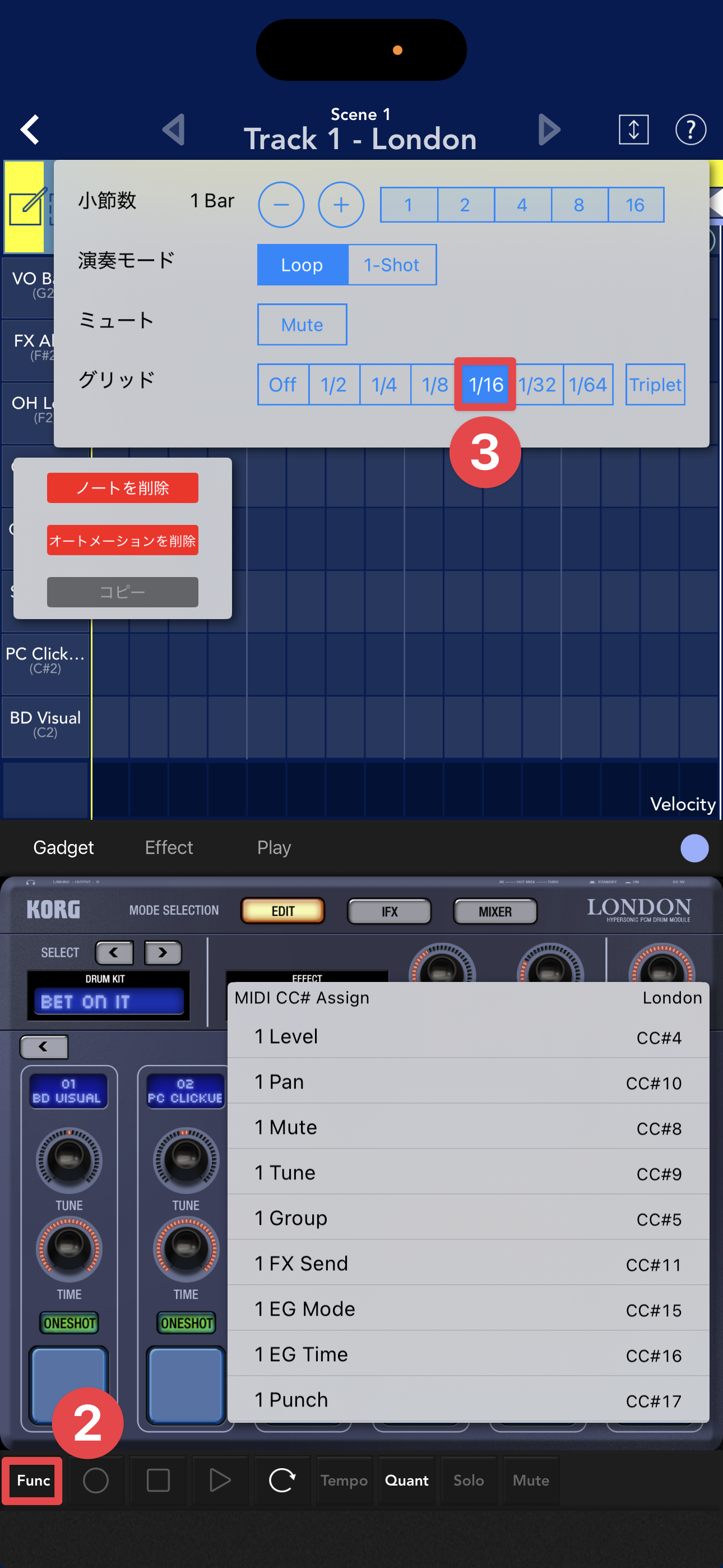 もしグリッドが1/16以外であれば、エディット画面左下にあるFunction②をタップしてください。そして右上に現れるパネル③で、グリッドの単位を変えることができます。