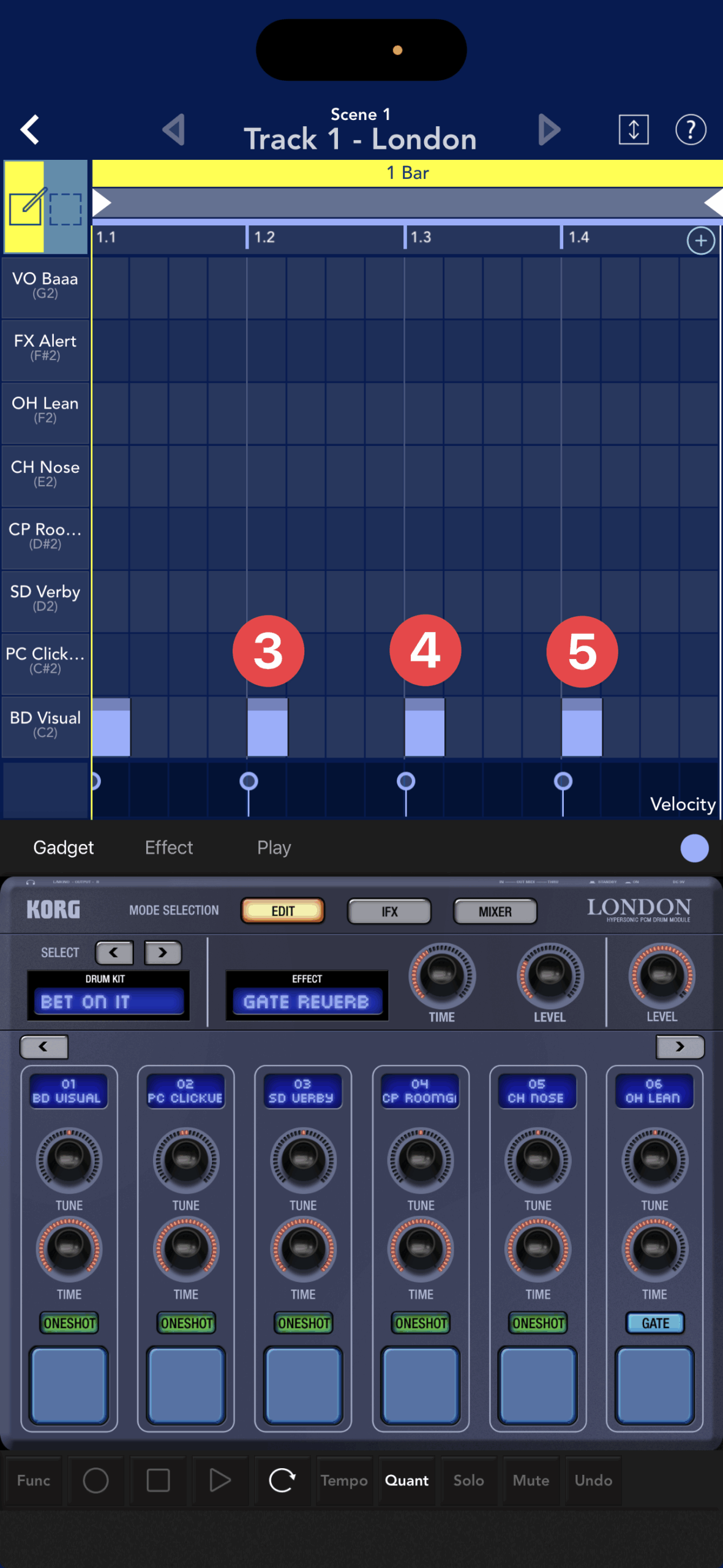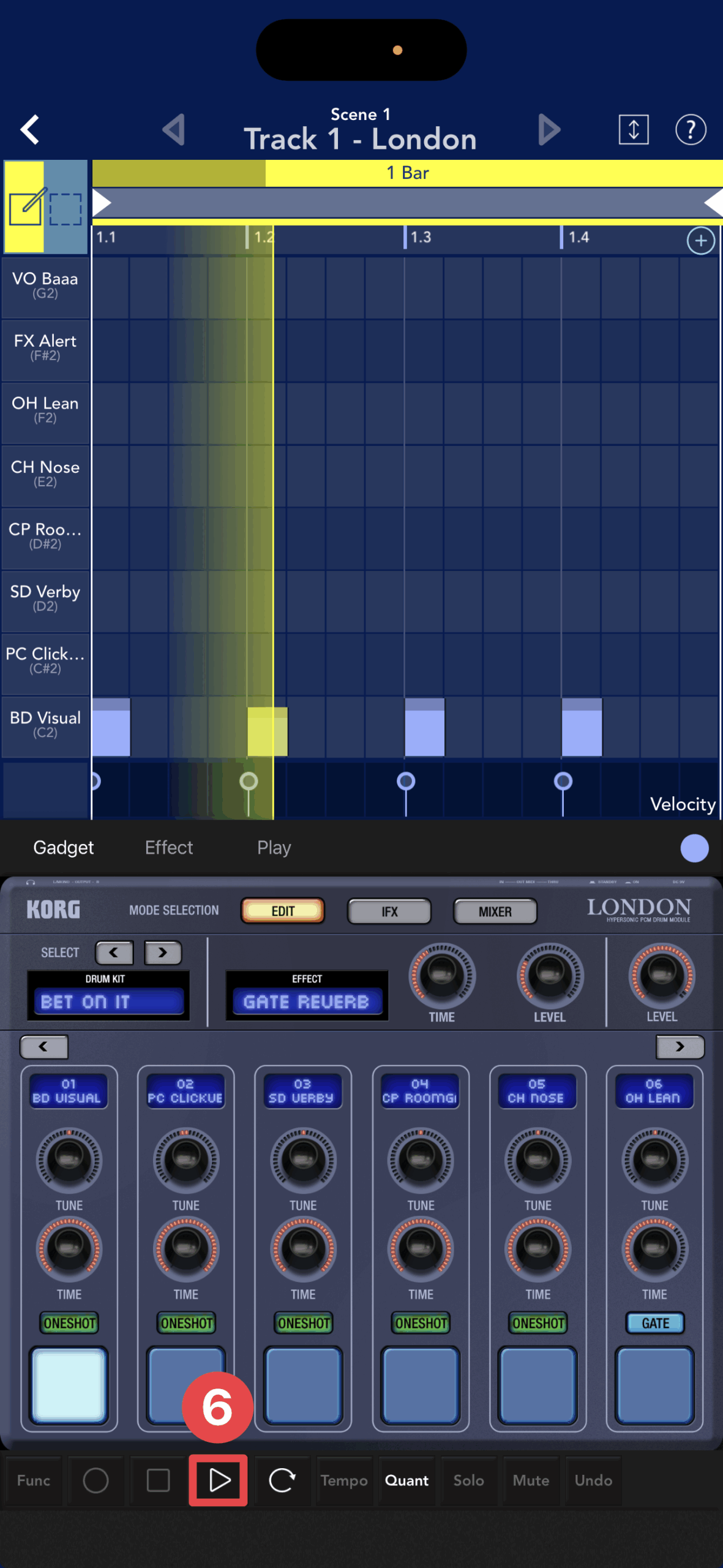 続いて、5マス目③、9マス目④、13マス目⑤にノートを入力していきます。そしてPLAYボタン⑥をタップすると、4つ打ちキックがループ再生されます。