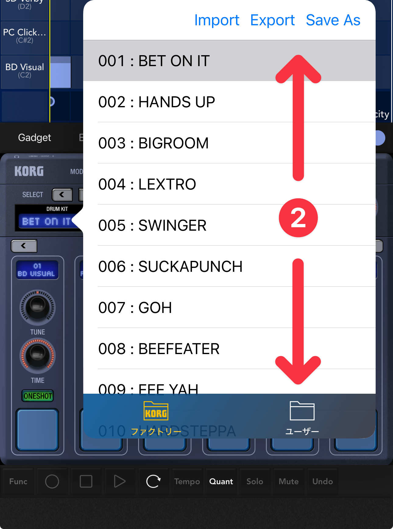 ドラムキット名が並ぶ吹き出しが現れるので上下スクロール②させ、好きなドラムキットを探してみましょう。