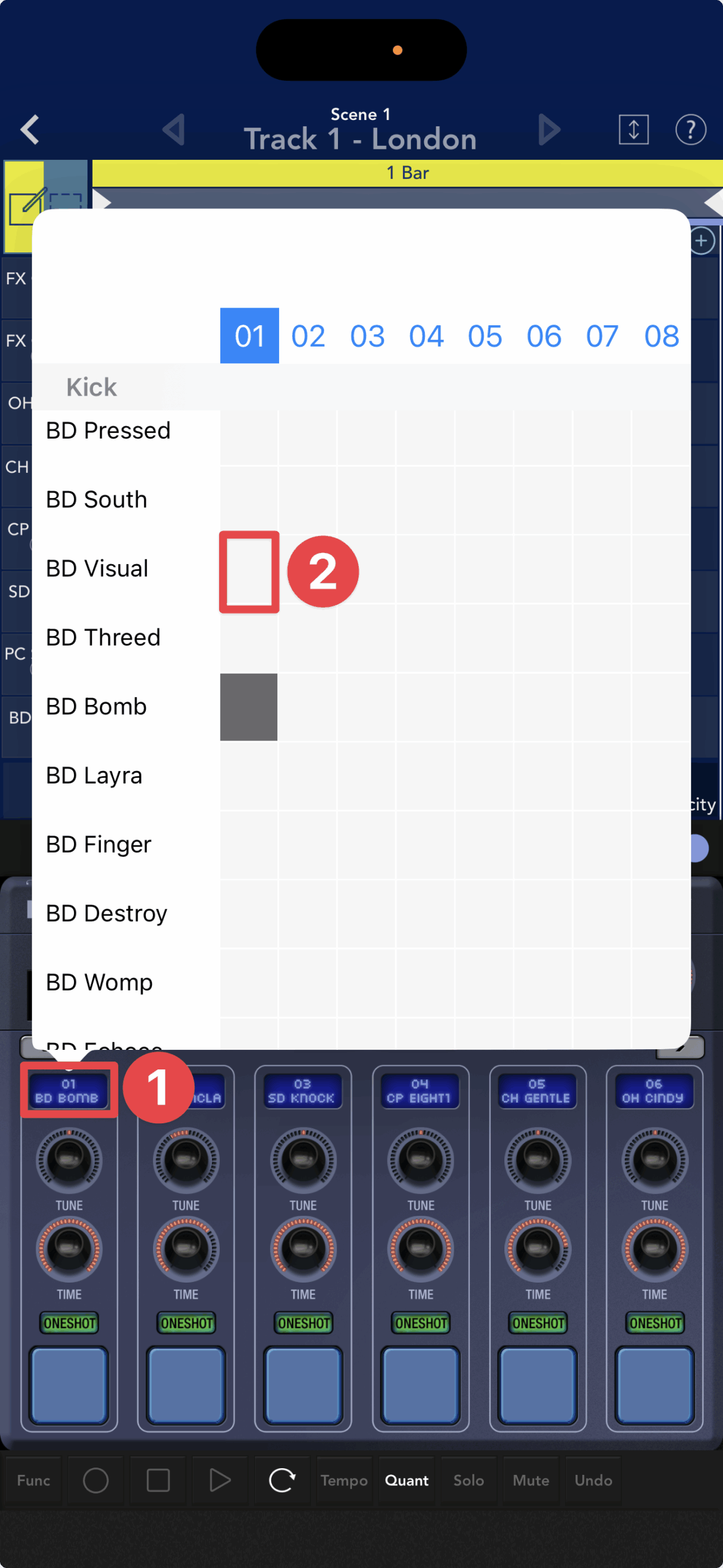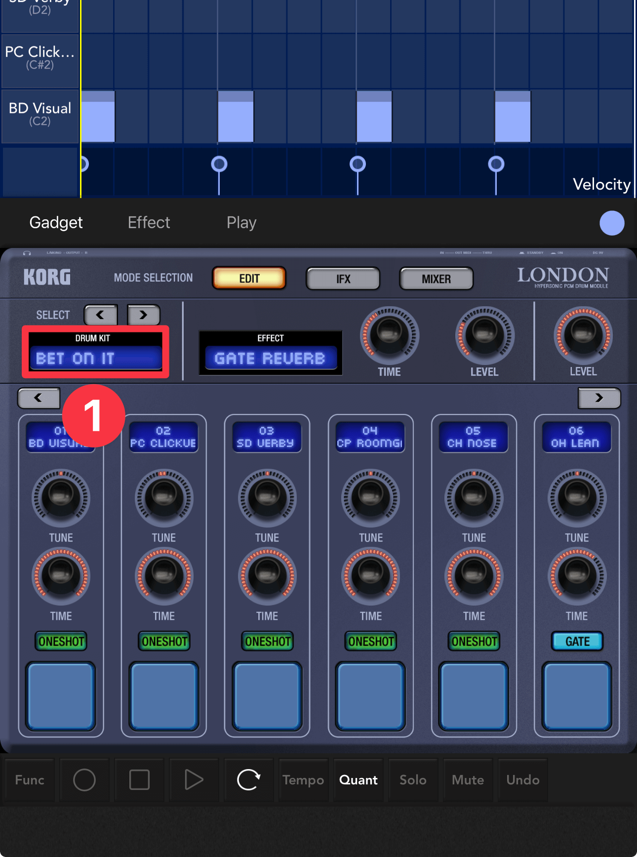 ドラムキットを変更するには、Londonのガジェットパネル左上にあるDRUM KIT①をタップ。